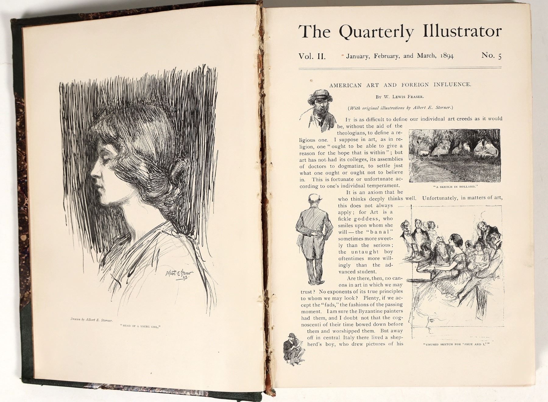 An 1894 copy of 'The Quarterly Illustrator', a publication for artists and art enthusiasts discussing the illustrators of the day and giving examples of their work. Includes hundreds of illustrations from classic illustrators, including some of the classic postcard artists. Bound in leather and marbled paper. Some toning, a few detached (but included) pages, cosmetic wear to cover; see photos. 7.25"x10"x1.5".