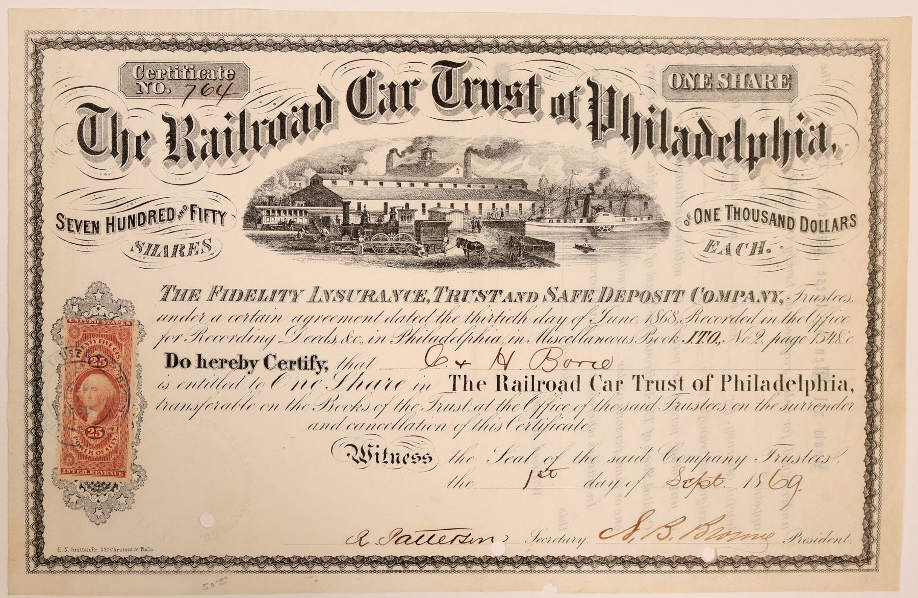Incorp Pennsylvania 1869. #764, I/C, One share @ $1000 ea. issued Sept 1, 1869 signed S.B. Bromy president. Black, embossed seal, vignette top train w/factory background. 25c revenue stamp left side. E.N. Grattan printer. EF