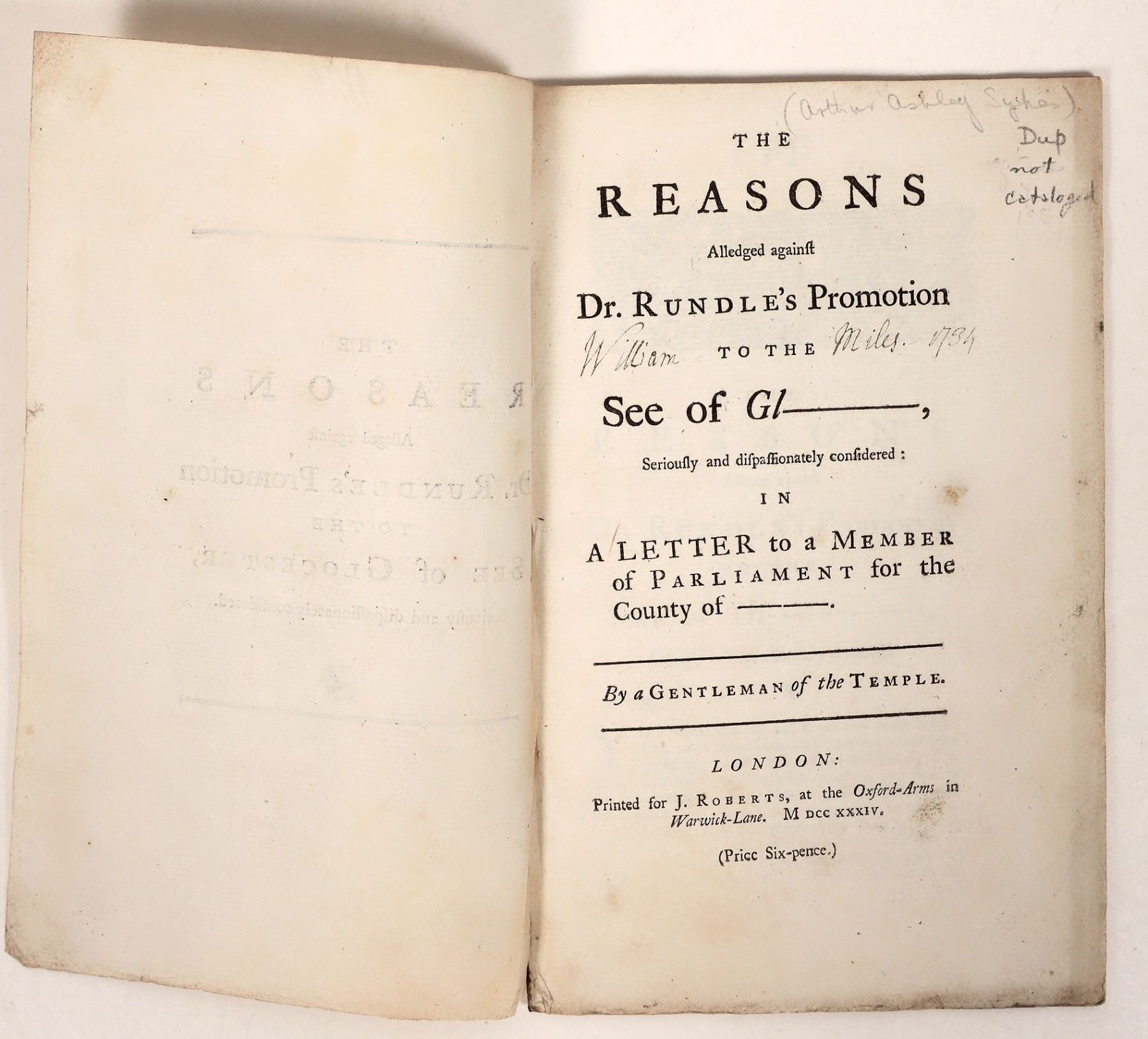 The Reasons Alleged against Dr. Rundle's Promotion to the See of Glocester in paperback c. 1884 [191