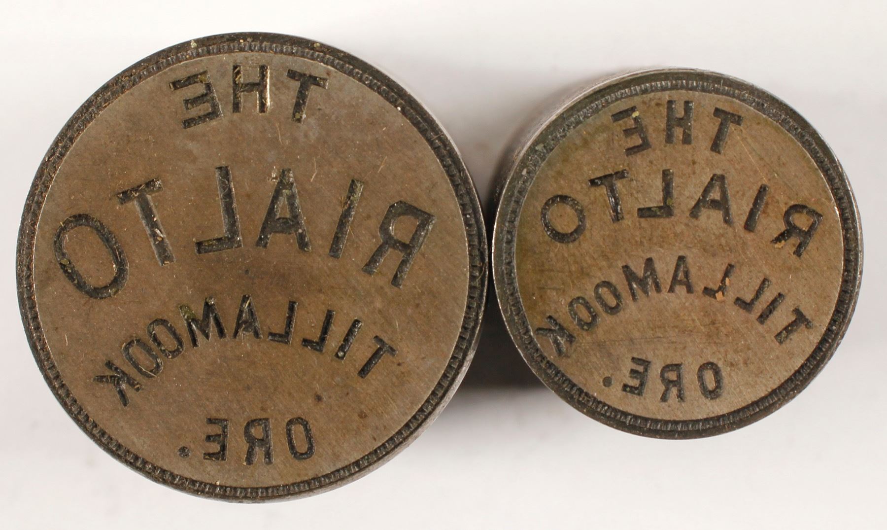 Lot of two: The / Rialto / Tillamook / Ore.; 24 & 30 mm. NWT Mint Historic Die Collection. State: Oregon City: Tillamook Date: HWAC# 86342