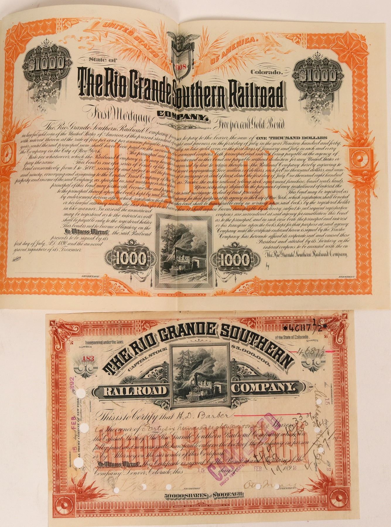 Founded in 1889 by Otto Mears, and construction began in 1890 from Ridgway (north of Ouray) and Durango (south of Silverton) to go around the most rugged part of the San Juan Mountains and also reach the mining towns of Rico and Telluride.Running from Durango to Ridgway in the western part of the US state of Colorado. The last train ran on the RGS in 1953 when it filed with the Interstate Commerce Commission for abandonment on 24 April 1952. Much of it remains with Knott's Berry Farm-Calico and SilvertonTrain (which has been in continuous steam service since 1881). 1. #A83 I/C, 4,687.5 shares @ $100 ea. issued Feb 15, 1892 signed Otto Mears President. Orange, no seal, vignette 4-4-0 exiting tunnel r-l, SHARES $100 EACH orange underprint, . Homer Lee Bank Note Co. EF 2. #4908,U/U, $1000 First Mortgage 5% gold bearer bond dateline July 1, 1890. Orange, no seal, vignette 4-4-0 r-l in box frame.$1000 orange underprint, coupons 1-100 attached. Homer Lee Bank Note Co. AU