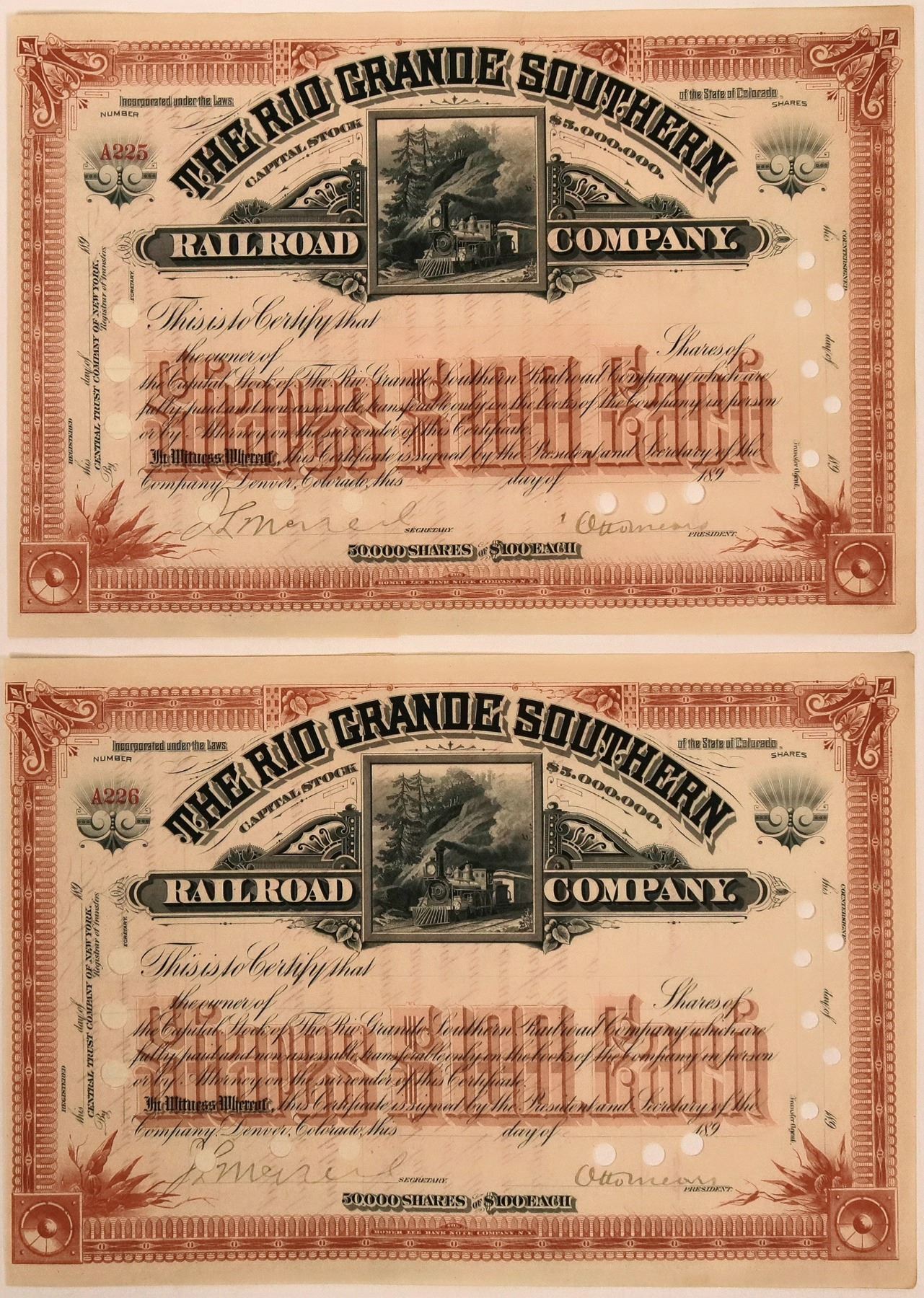 2 certificates. Founded in 1889 by Otto Mears, and construction began in 1890 from Ridgway (north of Ouray) and Durango (south of Silverton) to go around the most rugged part of the San Juan Mountains and also reach the mining towns of Rico and Telluride.Running from Durango to Ridgway in the western part of the US state of Colorado. #A225 & A226, U/C, $100 par shares, dateline 189_, Red-Orange, clear signatures of J.L Mc Neil Secretary ( also Board of Directors) and Otto Mears President.4-4-0 passing hillside in box frame. Receipt attached. punch hole cancellation. Homer Lee Bank Note Co. printer. EF