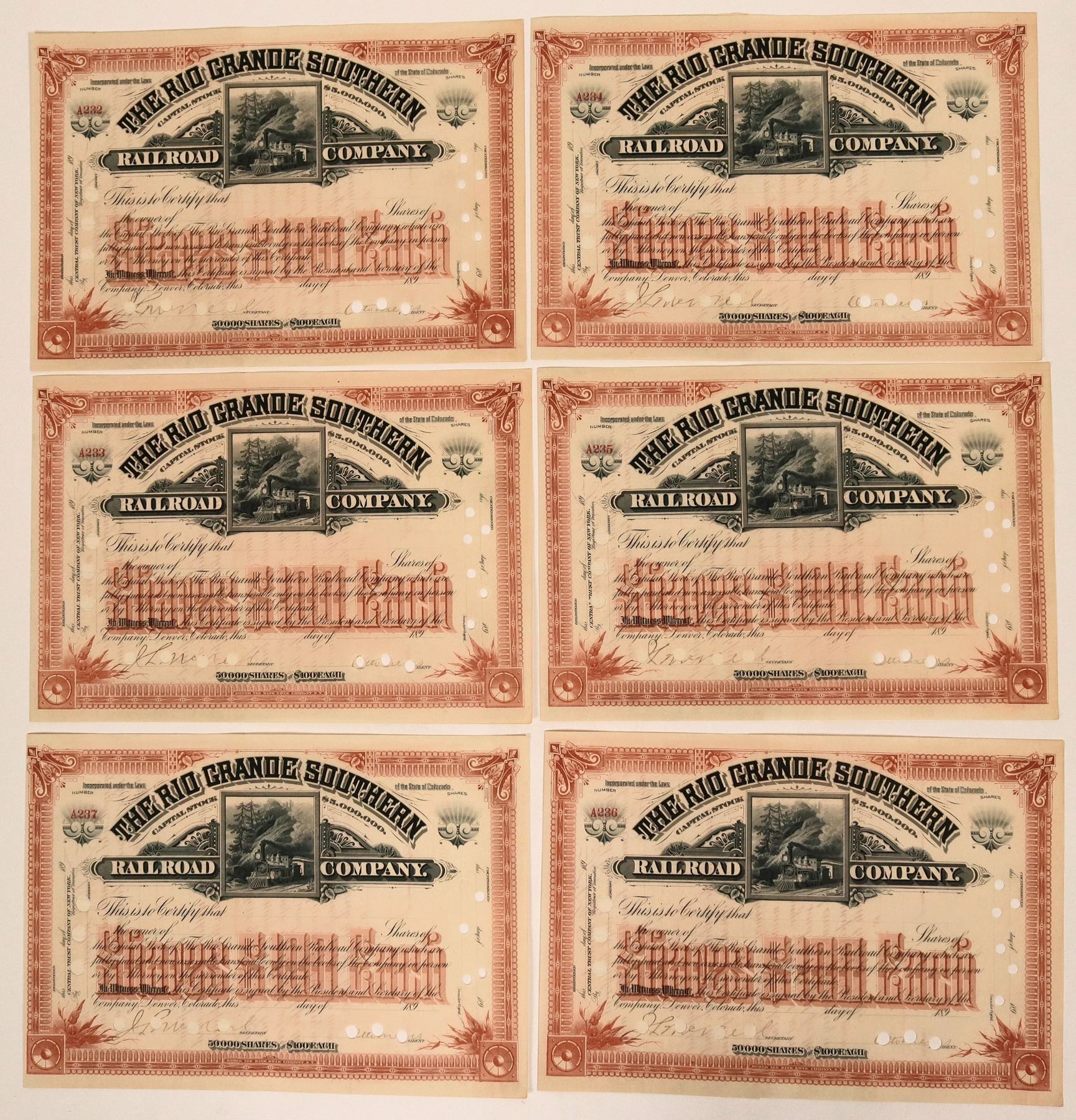 5 certificates. Founded in 1889 by Otto Mears, and construction began in 1890 from Ridgway (north of Ouray) and Durango (south of Silverton) to go around the most rugged part of the San Juan Mountains and also reach the mining towns of Rico and Telluride.Running from Durango to Ridgway in the western part of the US state of Colorado. The last train ran on the RGS in 1953 when it filed with the Interstate Commerce Commission for abandonment on 24 April 1952. Much of it remains with Knott's Berry Farm-Calico and SilvertonTrain (which has been in continuous steam service since 1881). Certs A232-A237 consecutive. U/C signed by Jl. Mc Neal Sec. (board of directors ) , Otto Mears President. Punch hole cancellation over signatures, readable, Red-Orange, vignette 4-4-0 passing hill, SHARES $100 EACH underprint, Homer Lee Bank Note Co. Receipts attached. VF-EF.