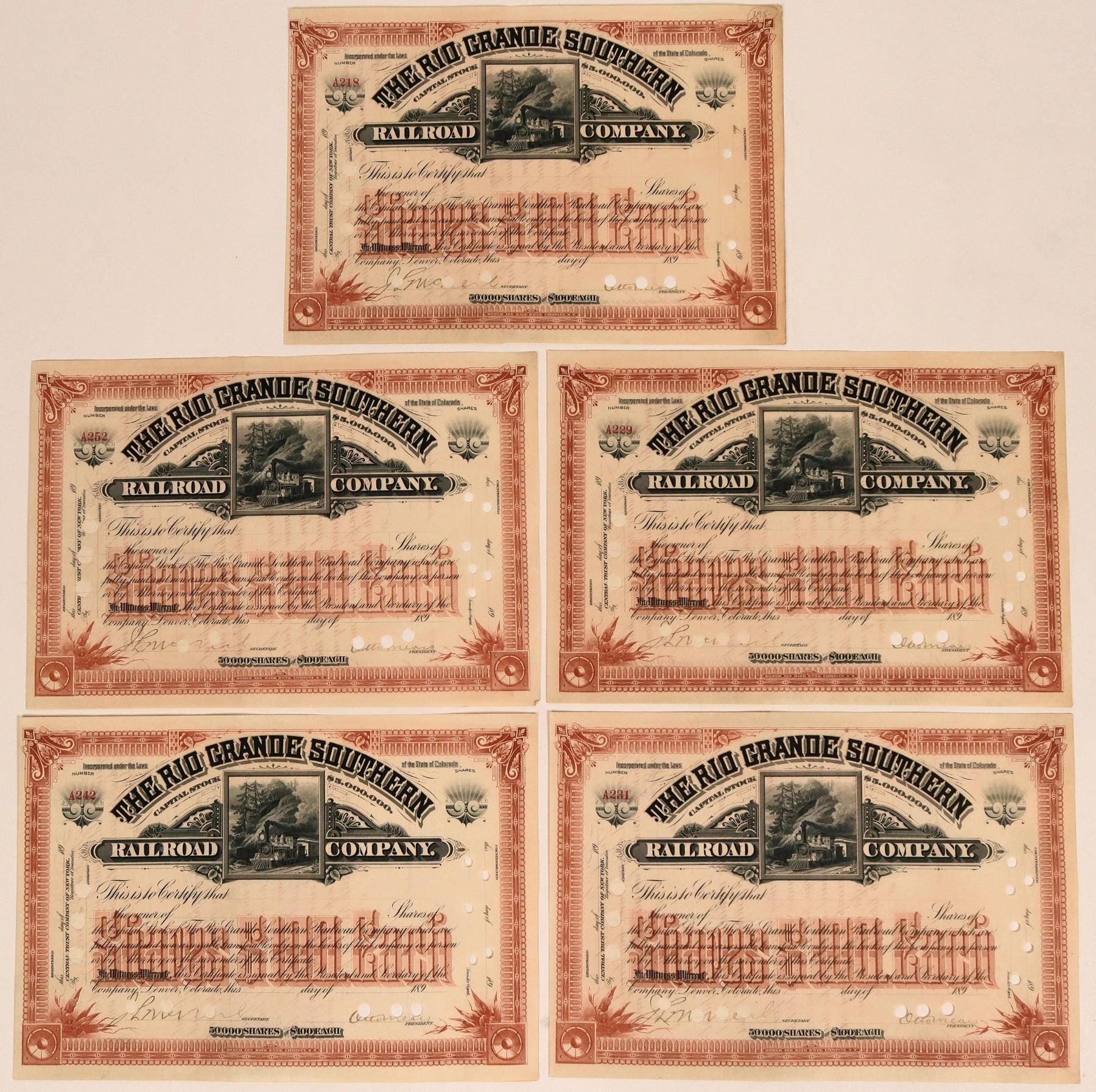 5 certificates All U/C (heavy cancellation), $100 par dateline 189_, signed J.L Mc Neal secretary and Otto Mears president. Red/Orange, no seal, vignette 4-4-0 passing hill in box scene. Homer Lee Bank Note Co, receipt attached.