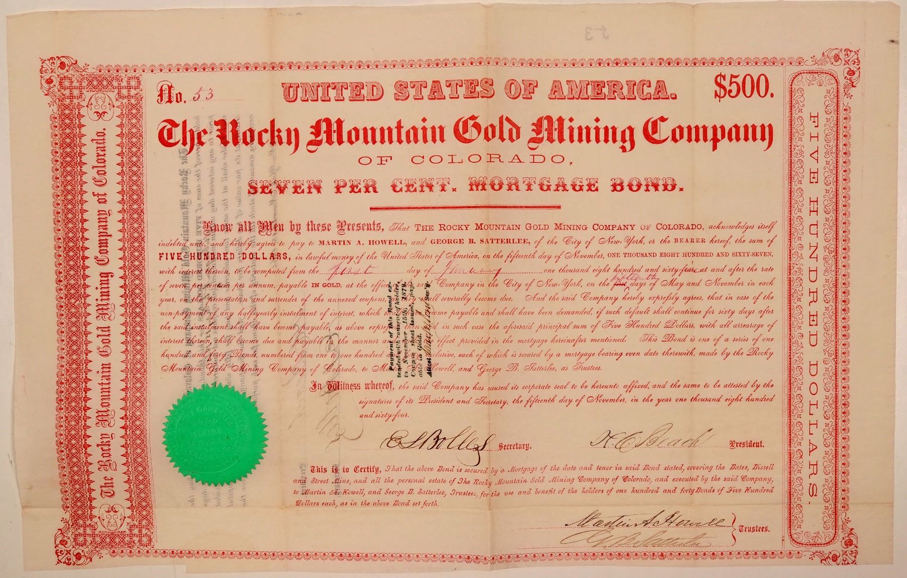 Incorp. 1864 state of New York. #53, I/U, $500 , 7% , bearer bond issued Nov 15, 1864, due 1867. Signed H.C. Beach president. Red, green corp embossed seal. No vignette. Stamped note on front extending payment until 1878. Printer not identified. In excellent condition.