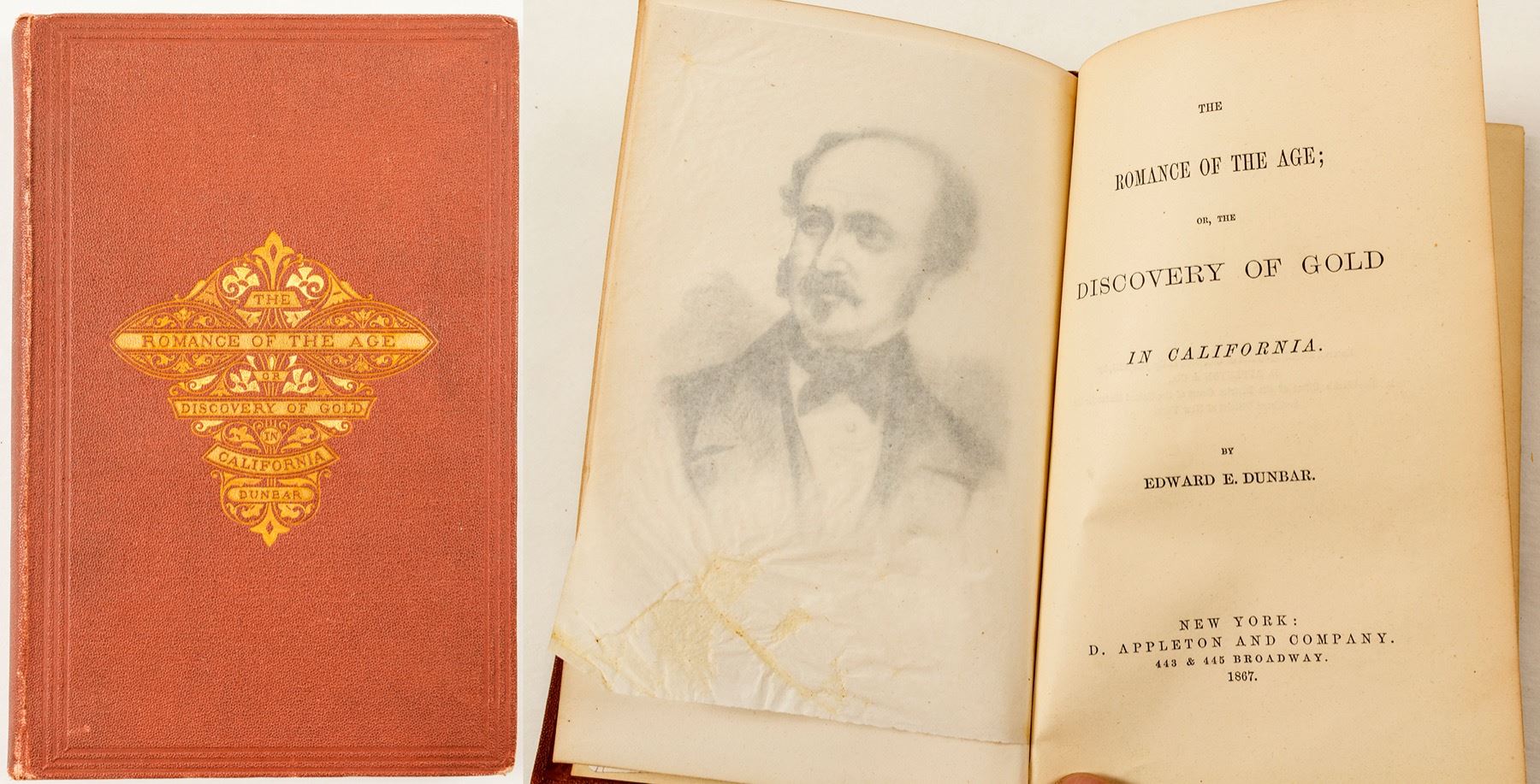 “The Romance of the Age / The Discovery of Gold / California / Dunbar. Book by Edward E. Dunbar. Published by D. Appleton and Company, 1867. 7.25" x 4.5". 134 pp. Dark red cover embossed title in gold. Very good condition. Nice Illustrations. Rare.