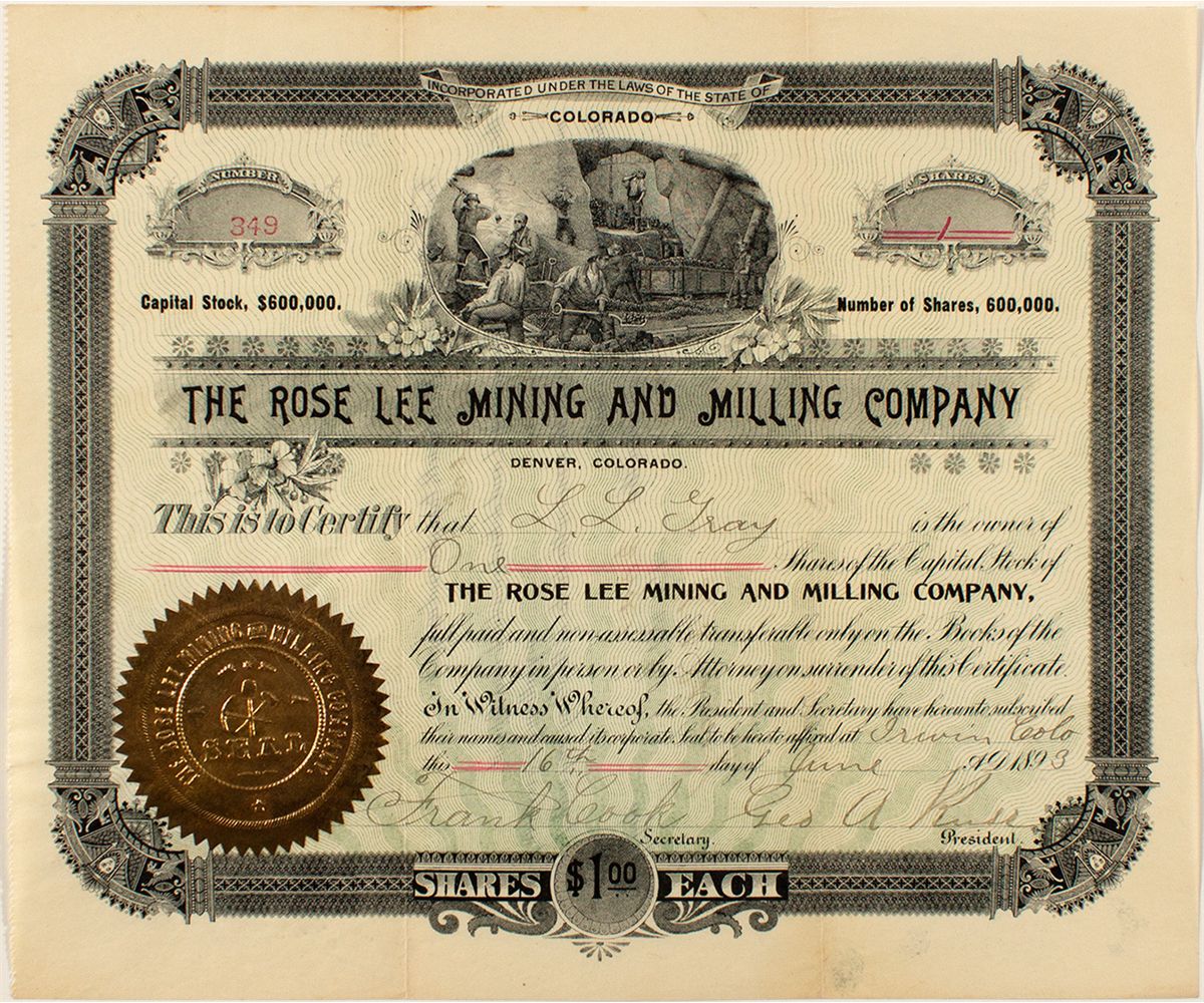 Cert. #349, issued at Irwin, Colorado in 1893 to L.L. Gray for one share. We could find no reference to this company or a Rose Lee mine in Colorado. The company did have a mailing address in Denver. Since this was issued at Irwin in Gunnison County, maybe the mines were located there. Uncancelled. VF.City: IrwinCounty: GunnisonState: CODate: