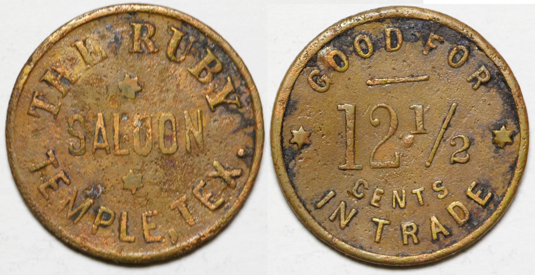 The Ruby Saloon // GF 12 1/2 cents IT. Reported Rare token. State: Texas City: Temple Date: HWAC# 85366
