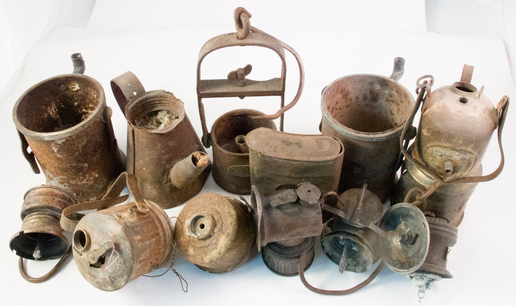 Approximately 20 rusty underground mining artifacts, all lighting devices of some sort. Includes Wolf lamps, standard carbides, teapot and other treats. A perfect display group for any underground display of rusty mining goodies. State: City: HWAC#: 42534 Date: