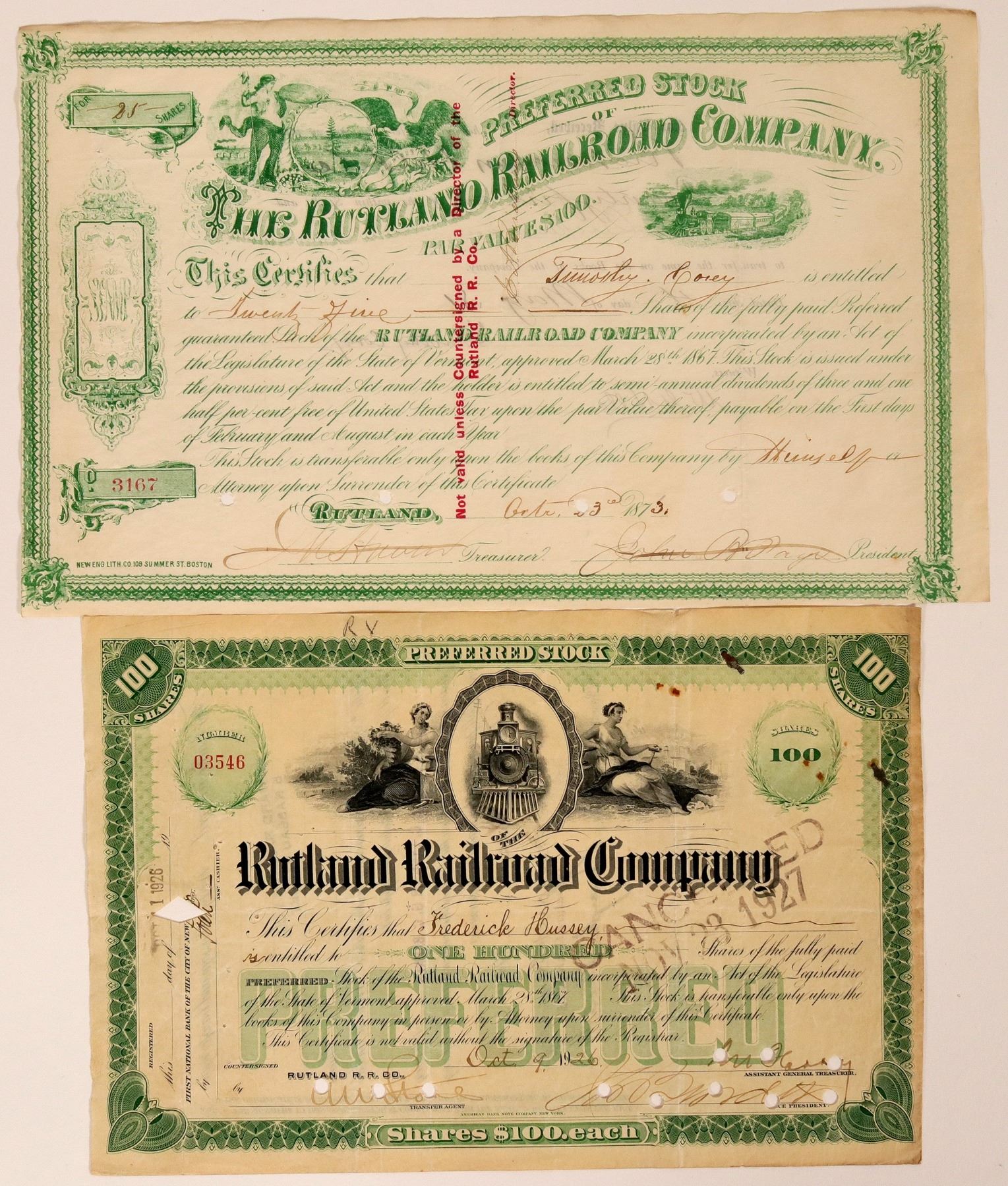 2 certificates. Rutland & Burlington Railroad, was chartered in 1843, the state railroad commission in 1855 Charles Linsley, the Rutland and Burlington's counsel , first person appointed to the position.By 1867 the Rutland & Burlington Railroad had changed its name to simply the Rutland Railroad. 1. #03546, I/C, 100 shares preferred stock issued Oct 1926. Green, vignette top two allegorical females either side of train. PREFERRED green underprint. American Bank Note Co. 2. #25, I/C, 25 shares preferred stock issued Oct 1875. Green, embossed seal, vignette top allegorical female and eagle holding state seal, below title train r-l. New England Litho printer.