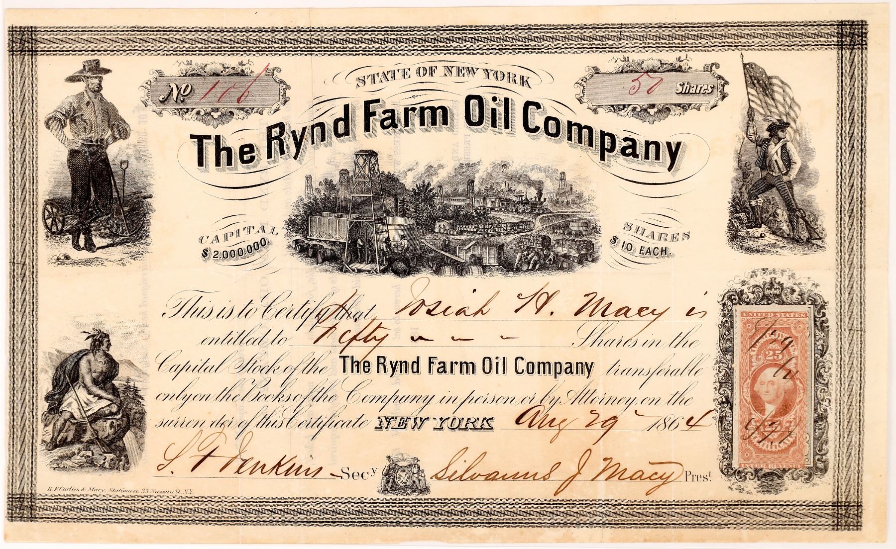 Inc. in New York. No. 116, issued for 50 shares to Josiah H. Macy in New York in 1864. Signed by president Macy and secretary Jenkins. Not cancelled. Attractive design with four vignettes: oil derricks and barrels (center), Native American (bottom left), farmer (upper left), and American soldier hoisting flag (upper right). Printed by BF Carlies & Macy, NY. 25 cent US IR Certificate stamp attached at bottom right. Folds, some discoloration. 6.5 x 10.5" Rynd Farm was located at Oil Creek, Venango County, Pennsylvania. Venango County, Oil Creek Pennsylvania Ken Prag Collection