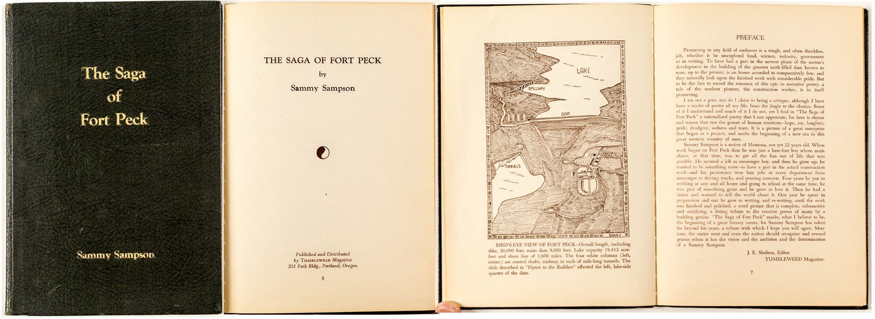 A book called "The Saga of Fort Peck" by Sammy Sampson about the building and construction of the Fort Peck Dam. A New Deal Public Works project with much less attention than that of Hoover dam, and is the largest dam on the Missouri River. State: Montana City: Fort Peck HWAC#: 40830 Date: