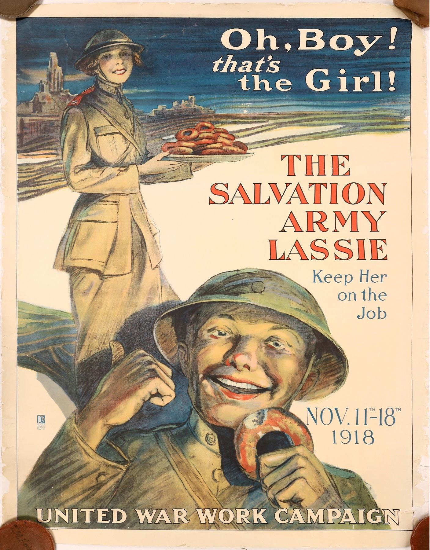 This war poster is paper on heavy canvas and very fragile at 30 x 40 inches. A WW1 poster "Oh boy, that's the Girl", "The Salvation Army keeping her on the job" for "the Salvation Army Lassie", Nov. 11th-18th, 1918. Armistice would end the shooting at 5 AM on Nov. 11th. Chips missing at the edges, fragile condition. From the Stuart MacKenzie collection.