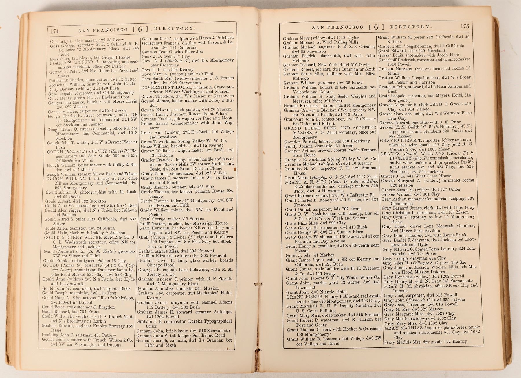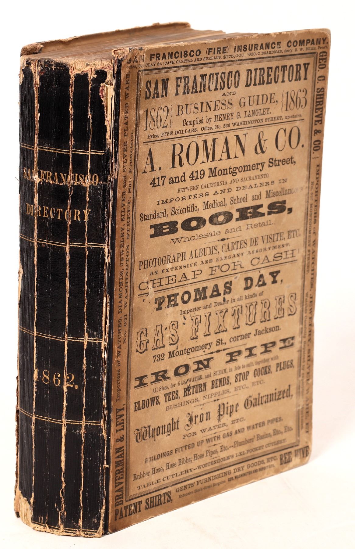 The San Francisco Business Directory for the Year Commencing September, 1861: Embracing a General Directory of Residents a Business Directory; a Directory of Streets, Public Offices, etc. and a New Map of the City: Together with the Consolidation Act and its Amendments; the Municipal Government; Societies and Organizations, and a Great Variety of Useful and Statistical Information, Exhibiting at a Glance the Progress and Present Condition of the City Fourth Year of Publication - Henry G. Langley Compiler. ii-lxiv (mostly advertisements, including front pastedown), 639 pp. (incl. rear pastedown, the final 57 pp. being more advertisements). 9x5.75, original leather-backed printed boards. The title page calls for "a reliable map of the city," not present with this copy. Vertical crack to spine, joints splitting, hinges cracked, board edges rubbed; some faint damp-staining; else very good.