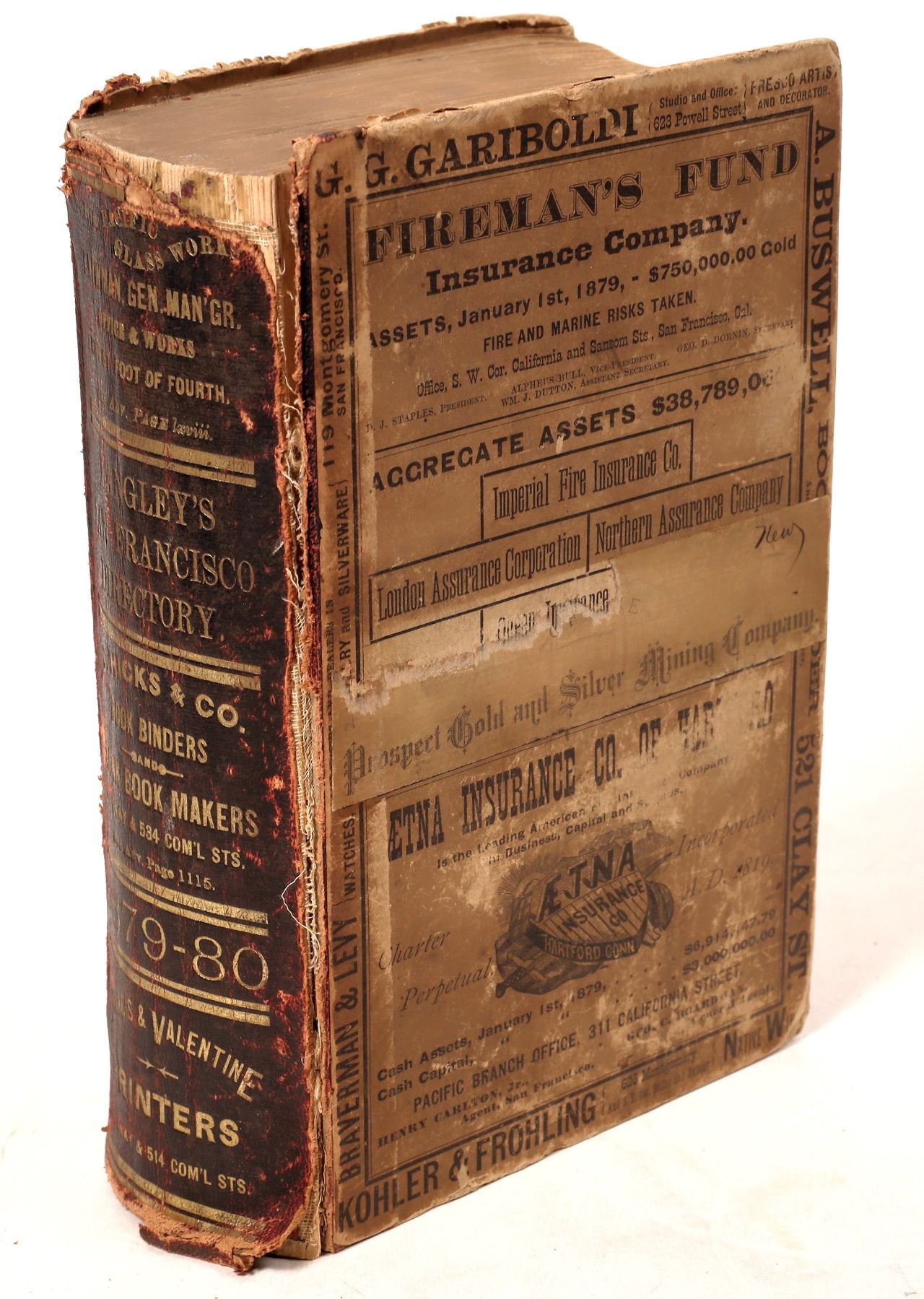 The San Francisco Directory for the Year Commencing April, 1879: Embracing a General Directory of Residents and a Business Directory - Compiled by Henry G. Langley Publisher, Frances & Valentine. lxviii, 1015 pp. Numerous woodcut illustrations in advertisements. (8vo) original morocco-backed printed boards. The twentieth year for this publication. Title page calls for "A Reliable of the City", not present in this copy. Edges worn, front joint and hinge cracked; otherwise good.