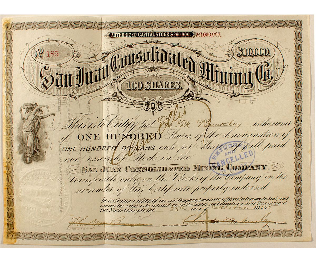 Incorporated under the laws of Colorado. Certificate # 185, issued to G.M. Binckley in 1875 for 100 shares. Both President and Secretary signatures have a line through them, making them illegible. Vignette of a woman dropping coins in center left. White embossed seal. White paper with black ornate border and black print. Blue cancelled stamp middle right, also pen cancelled. At top center, Authorized Capital Stock changed from $200,000 to 2,000,000 in red ink. Printer: J. McKittrick & Co., St. Lo uis. Some glue residue from where the stub had been on left edge. VF.City: Del NorteCounty: Rio GrandeState: CODate: