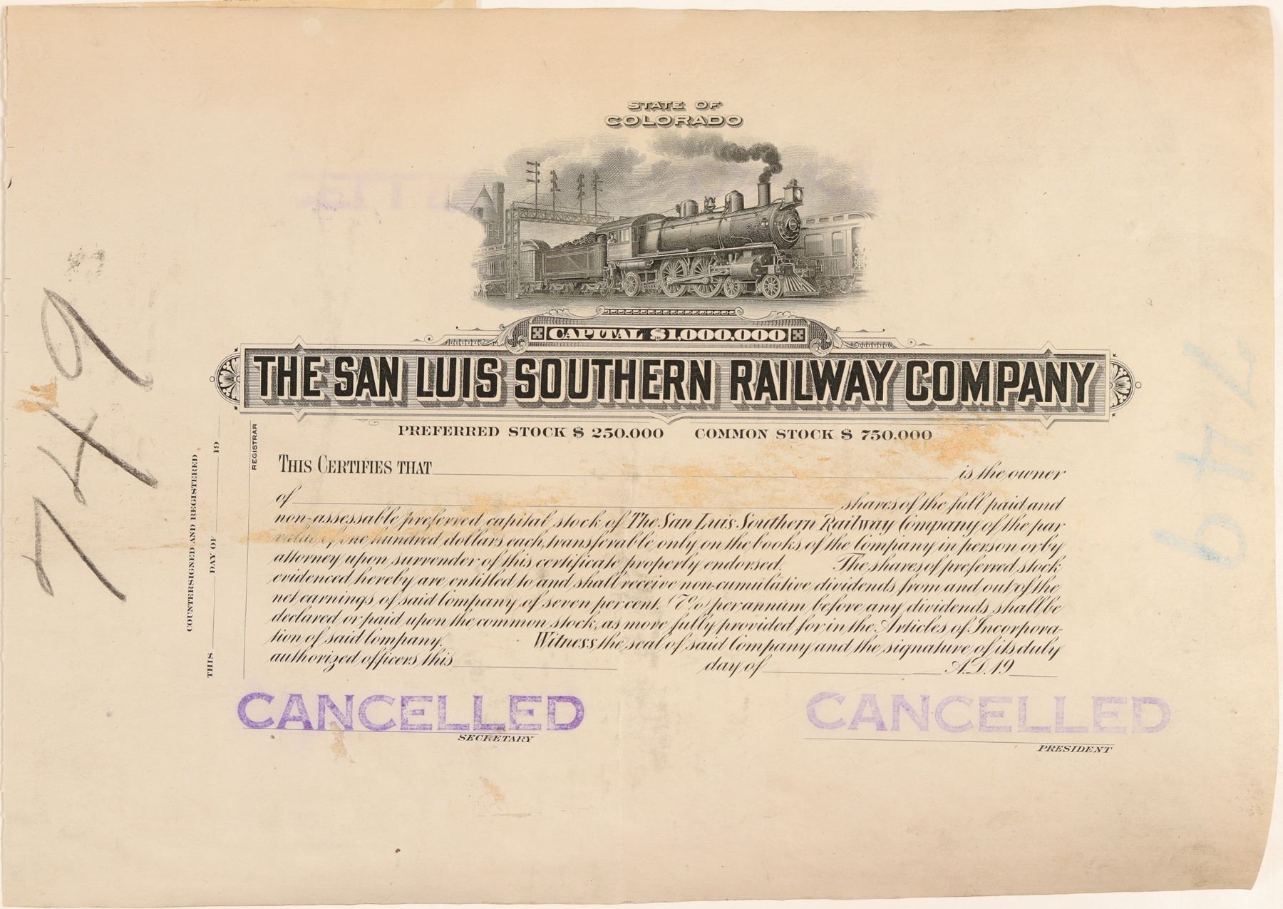 Stock Certificate from the The San Luis Southern Railway Co. Incorporated in Colorado. Printers Proof. Issued in c1901. Size 11 by 7.5 inches. In good condition. Train vignette. Founded in 1913 to haul sugar beets from grower to processor. The railroad is 13 miles long, located between Sugar Junction (east of Monte Vista, Colorado) and Center, Colorado. Creases and light toning.
