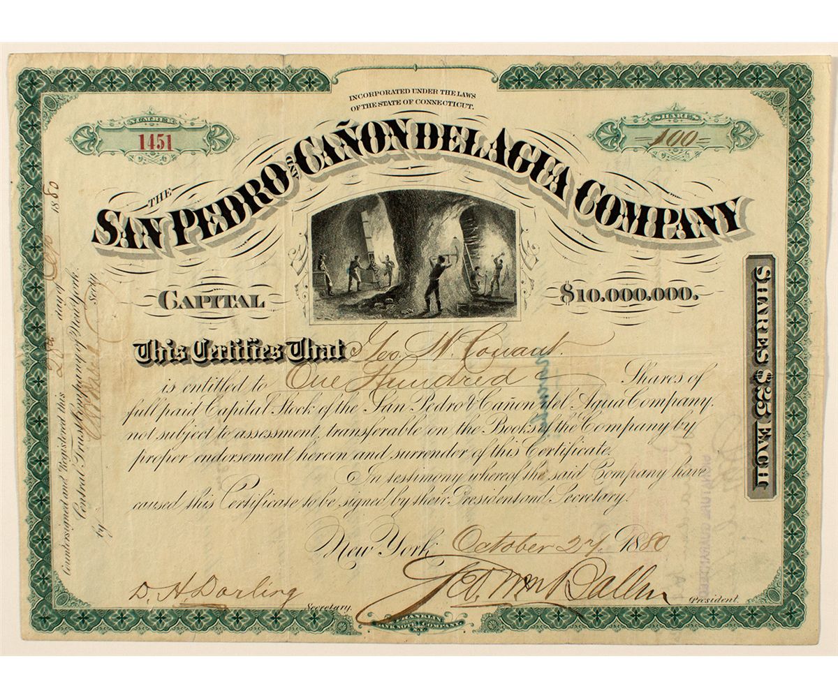 Cert. #1451, issued at New York in 1880 to Geo. W. Coward for 100 shares. Inc. in Connecticut. Signed by Geo. Wm. Ballou as president and D.H. Darling as secretary. In 1880, the company was formed and made a contract to buy the Ramirez land grant which was applied for in 1844 and approved by Congress in 1866. The grant was titled the "Canon del Agua" and was adjacent to the San Pedro land grant. The land was located near the placer of San Francisco called the "Placer Del Toro" and distant from that town about one league. When the company purchased the grant, there were already portions of the land and mines in dispute as miners were already working certain areas and contended that the mines were in the public domain. The New Placer district was a large “rich” placer district most active during the 1860’s that has since been cut into several smaller districts. This company ran a water line from the Sandia Mountains to various placer gold camps. They also had a mine, 20 stamp mill (one of the largest of the Territory), and smelter. They tried to get their property patented, but the Government balked at the application for 35,000 acres, and proceeded to bring charges of fraud against the company. The U.S. government was in litigation against the company for many years. Miners working underground vignette. Franklin Bank Note Company, N.Y., printer. Uncancelled.City: New PlacerCounty: Santa FeState: NMDate: