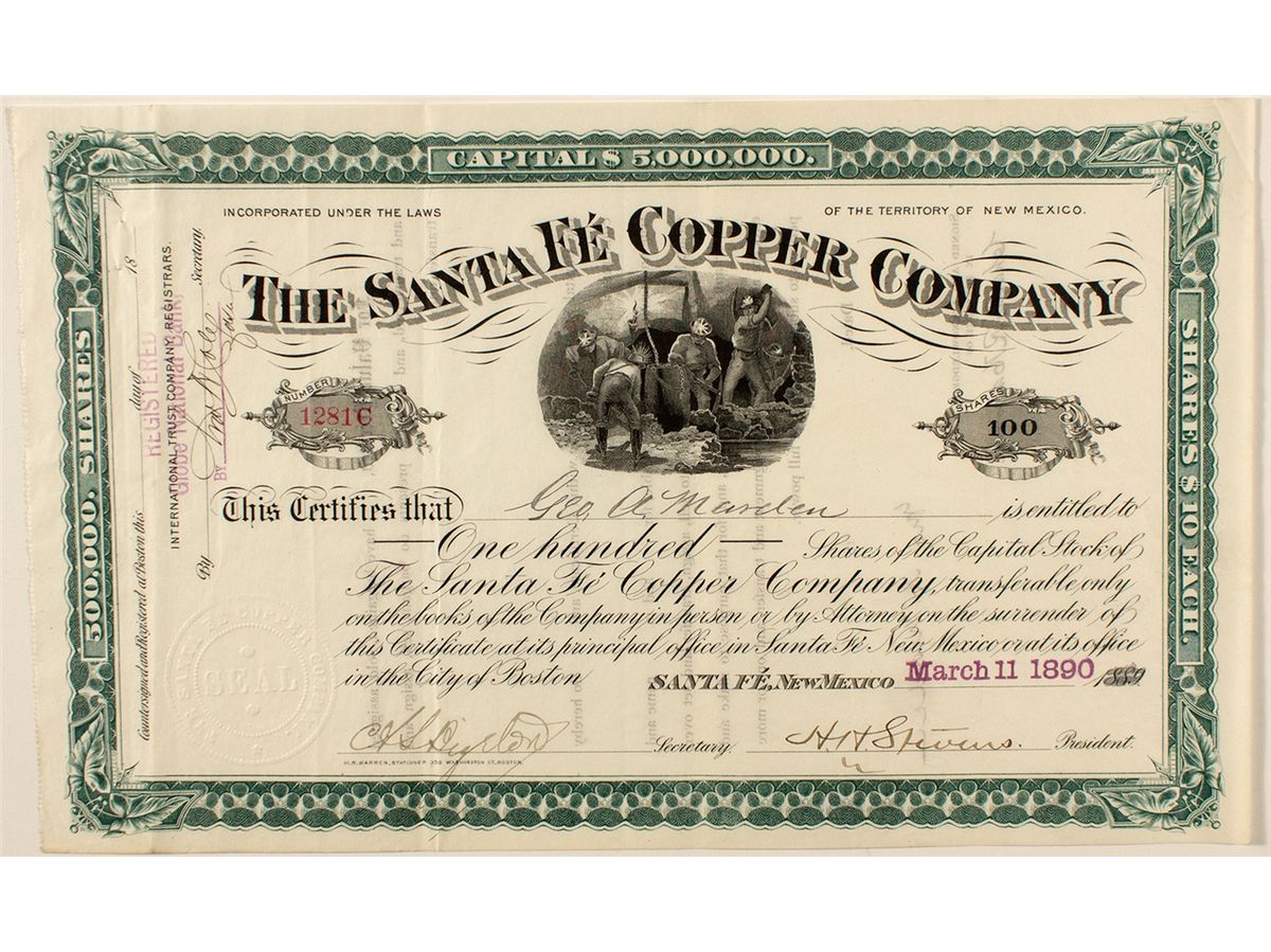 Cert. #1281C, issued at Santa Fe, N.M. in 1890 to Geo. A. Marden for 100 shares. Signed by H.H. Stevens as president and A.S. Bigelow as secretary. The company incorporated in 1888 under the laws of the Territory of New Mexico and went bankrupt in 1892. Re-organized as the Santa Fe Gold and Copper Mining Company. The company operated the San Pedro mine in Santa Fe County which was part of the old San Pedro land grant. The property had primarily low grade ore but immense tonnage. To be operated profitably, the ore needed to be concentrated and a railroad connection would be necessary. Miners underground. VF. Uncancelled.City: San PedroCounty: Santa FeState: NMDate: