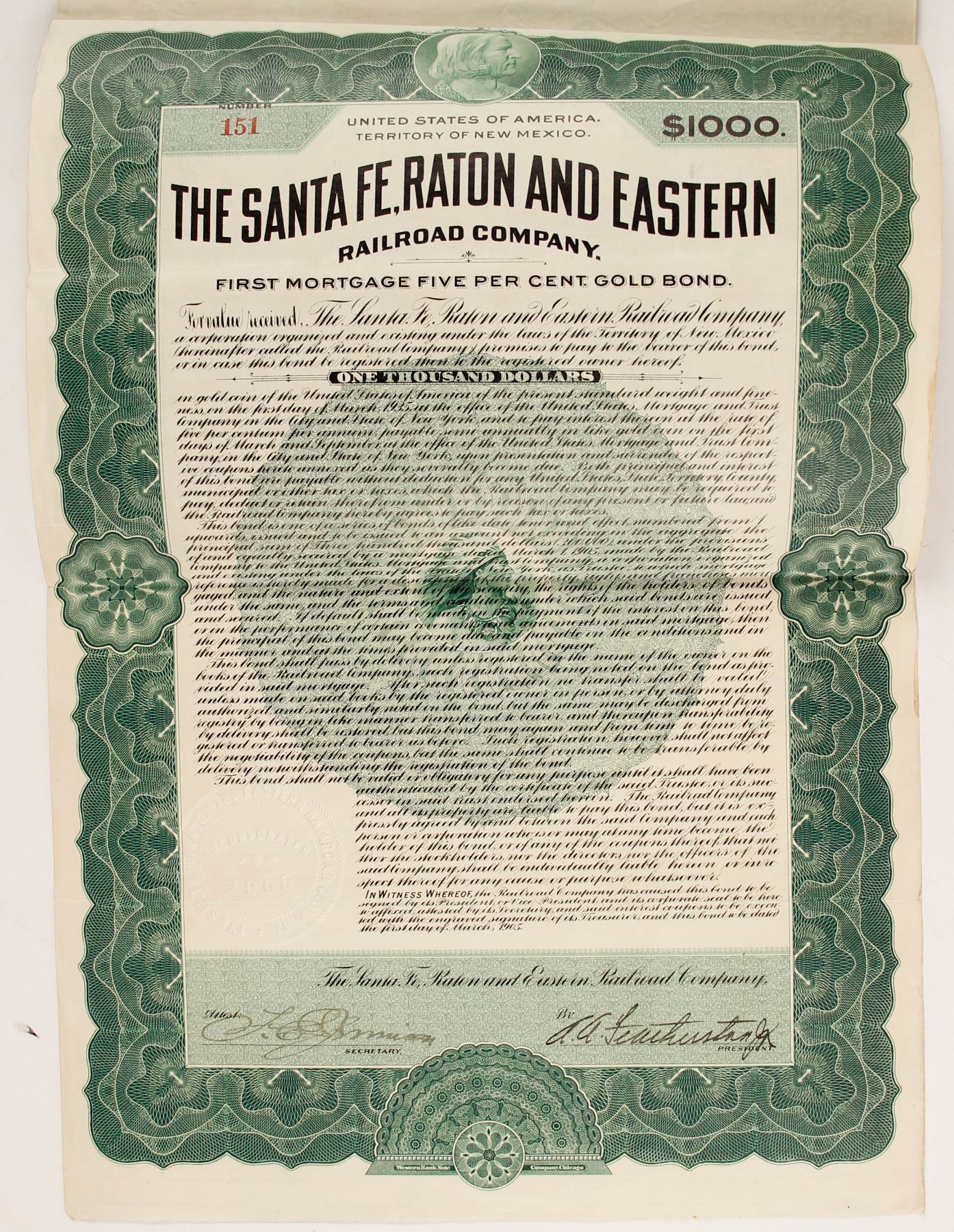 incorporated February 9, 1905 in the territory of New Mexico. #151, $1000, 30 year , First Mortgage 5% SCARCE Gold Bearer Bond Certificate issued March , 1905. This historic document was printed by the Western Banknote Company and has an ornate green border , vignette of a man's head. This item is hand signed by the Company's President. Coupons attached with 8 missing. The condition is EF+. Ken Prag Collection