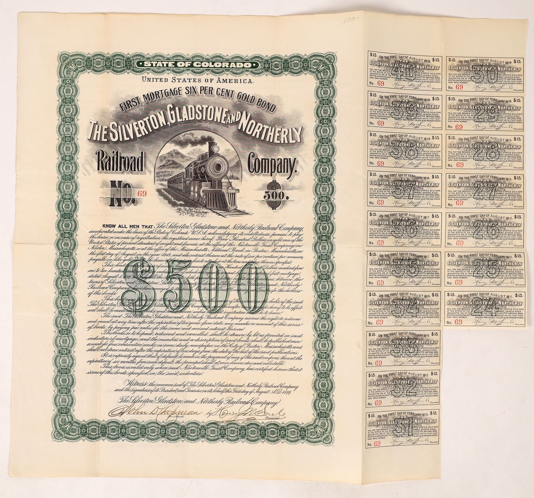 Incorp. April, 1899 Silverton, Co. #69 of 292, I/U, $500 First Mortgage, 6% gold bearer bond issued August 1, 1899, due 1919. Signed by pres. and treas. Green border , black printing, "$500" green underprint, top center vignette 4-4-0 left to right w/pullman cars, embossed corp. seal bottom left, 17 coupons attached. VF cond some discoloration at the folds.