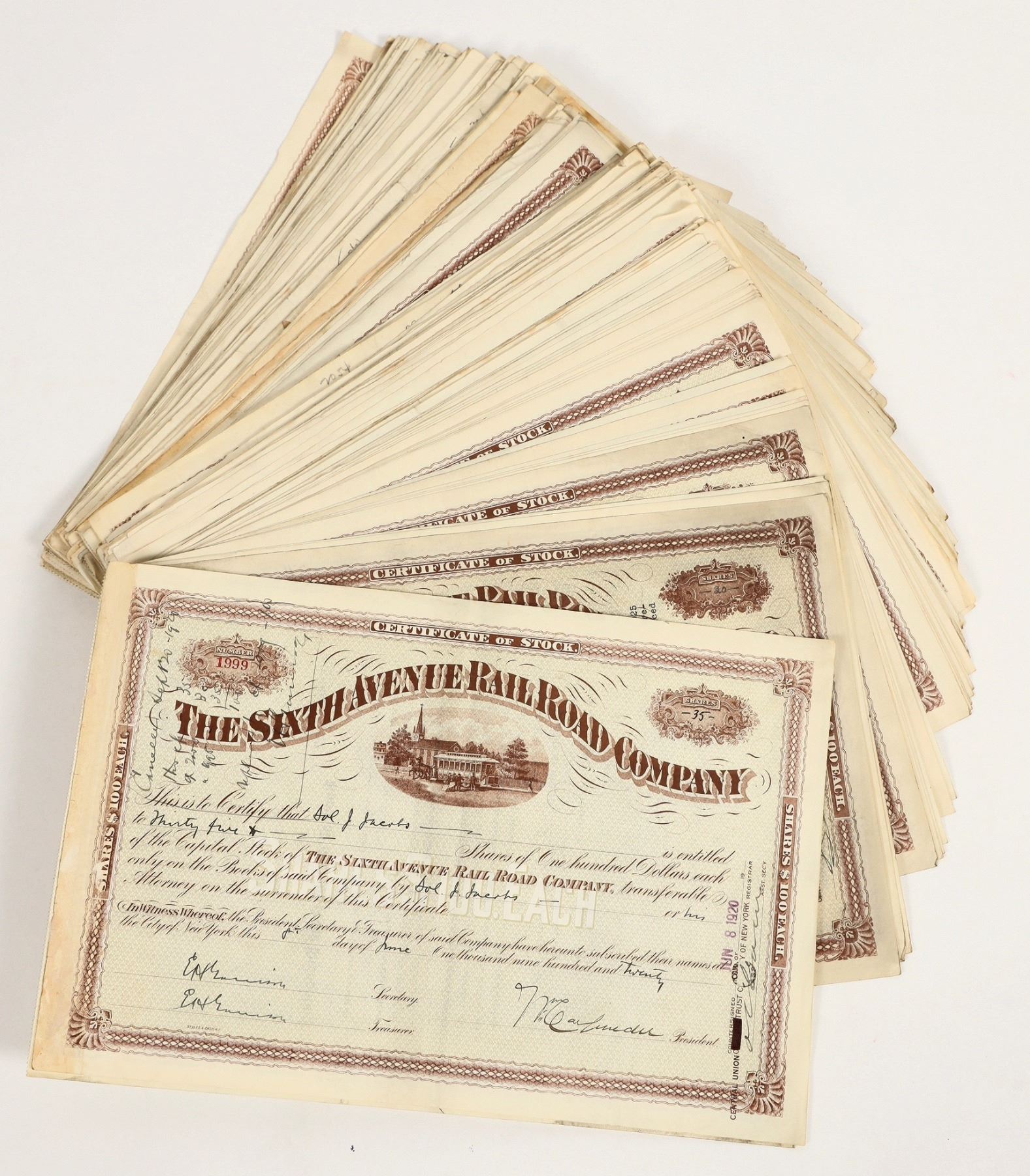 Approx.80+ . I/C. Issued 1919-25. VG or better. The Sixth Avenue Railroad Co. Stocks, some have revenue stamps. Operated street cars and the elevated railway