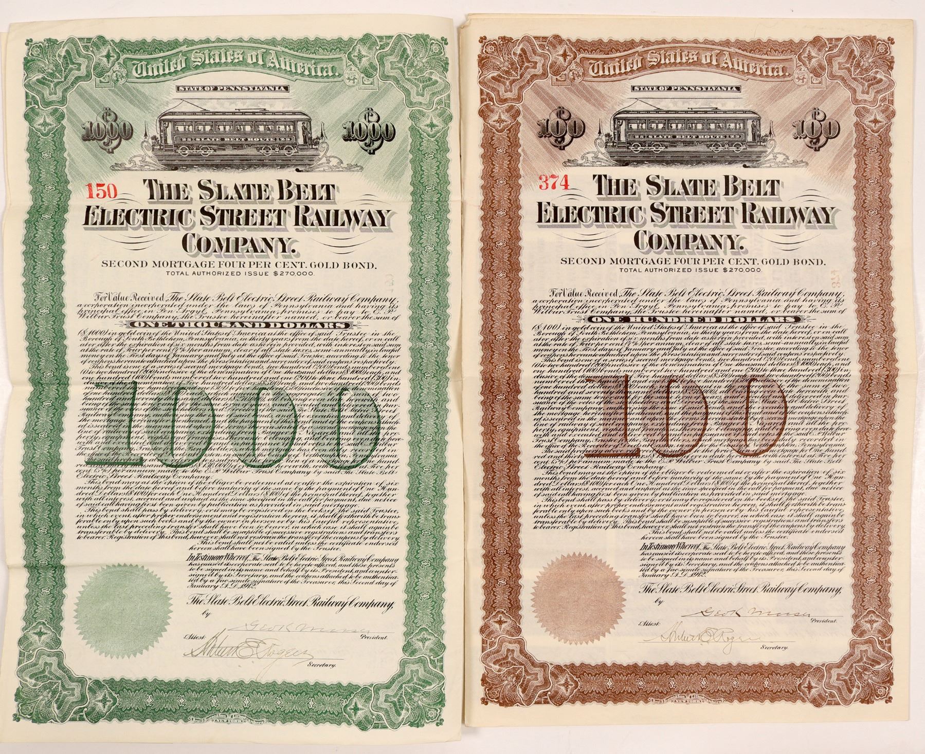26 November 1900 incorporated Pennsylvania. # 150 of 200 authorized, I/U, $1000, 4% Second Mortgage Gold Bearer Bond certificate issued Jan 2, 1912. GREEN, 1000 green underprint. Printed by the Beni D. Benson & Son Lithographers. Embossed seal. Has an ornate border around it with a vignette of an electric trolly car #25 w/company name on side. Coupons 12-60 attached. Near AU cond.