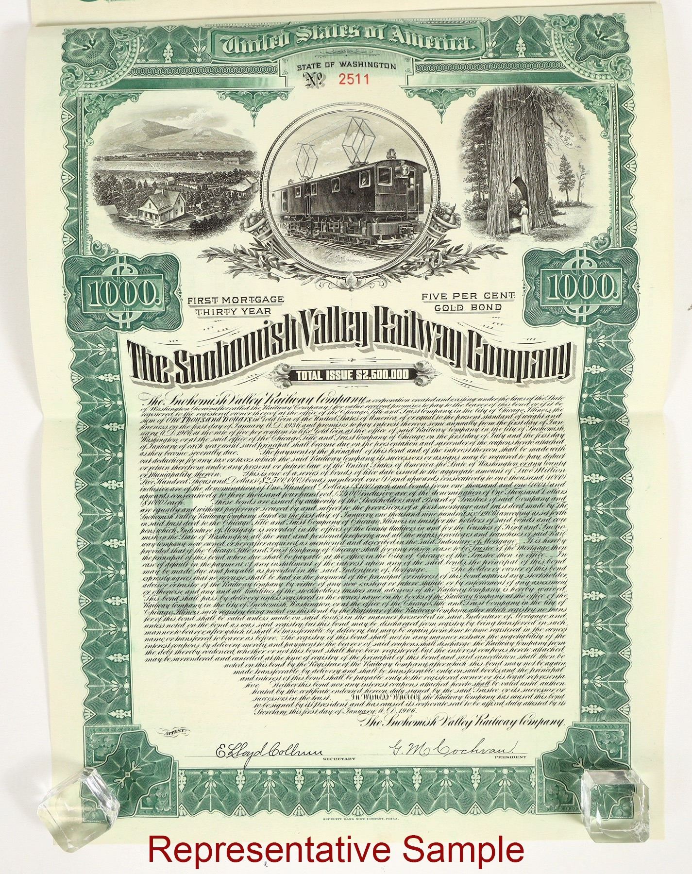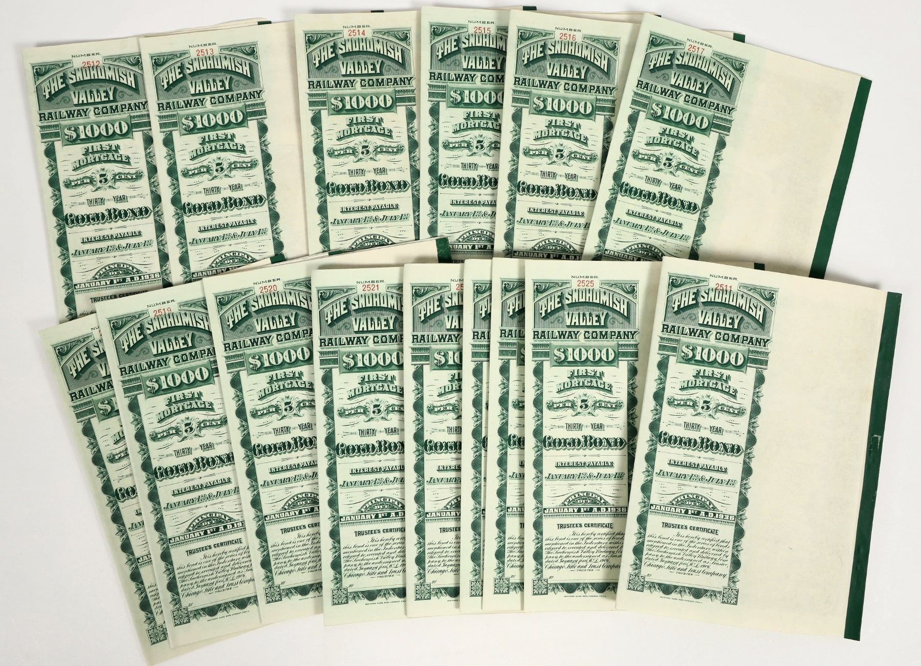 Lot of 15. I/U. Issued 1906 . EF cond. The Snohomish Valley Railway Co. $1000, 5%, gold bearer bonds. Security BNC printer.