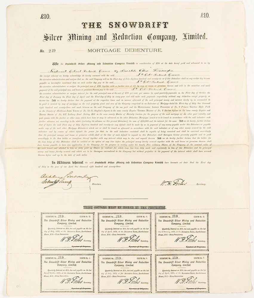 This came to us with three others. Before these three we had only seen one other mortgage debenture in 40 years. English Mortgage Debenture. To Colonel Frederick Connon of Scarsdale Villas, Kensington. Number 219. The Snowdrift seems to be one of the earliest mines sold to an English company from Colorado. John Collom and the British and Colorado Bureau arranged this in 1871. Ernest Le Neve Foster and Captain Bennett seemed to be in charge of this mine and the Silver Plume during this time. [British Investments in the American Mining Frontier, by Spence] Date: 1873 Location: Georgetown, Colorado HWAC # 44034