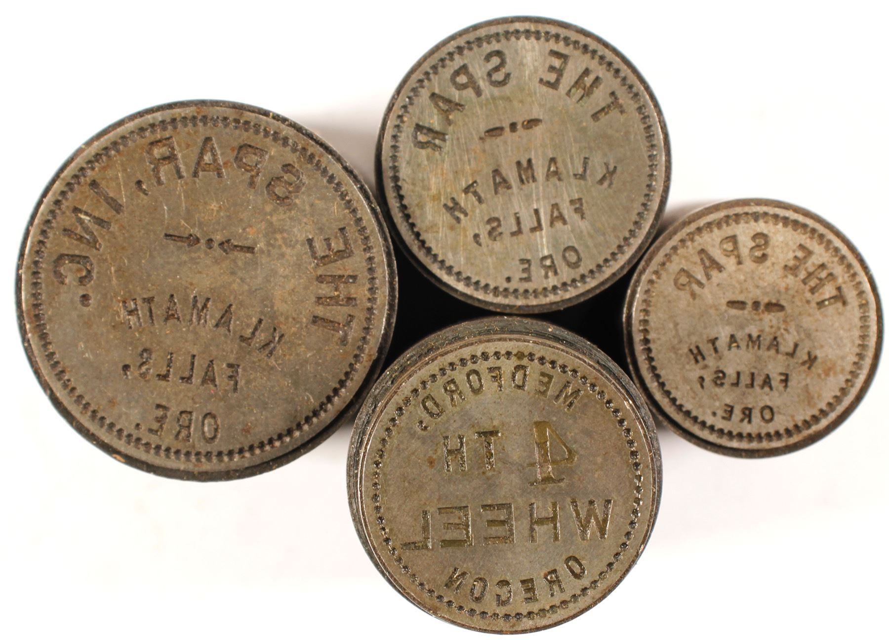 Lot of four: one from: Medford / 4th / Wheel / Oregon; 23 mm. Three from: The Spar / Klamath / Falls, / Ore.;21, 24 and 30 mm. NWT Mint Historic Die Collection. State: Oregon City: Klamath Falls/Medford Date: HWAC# 86339