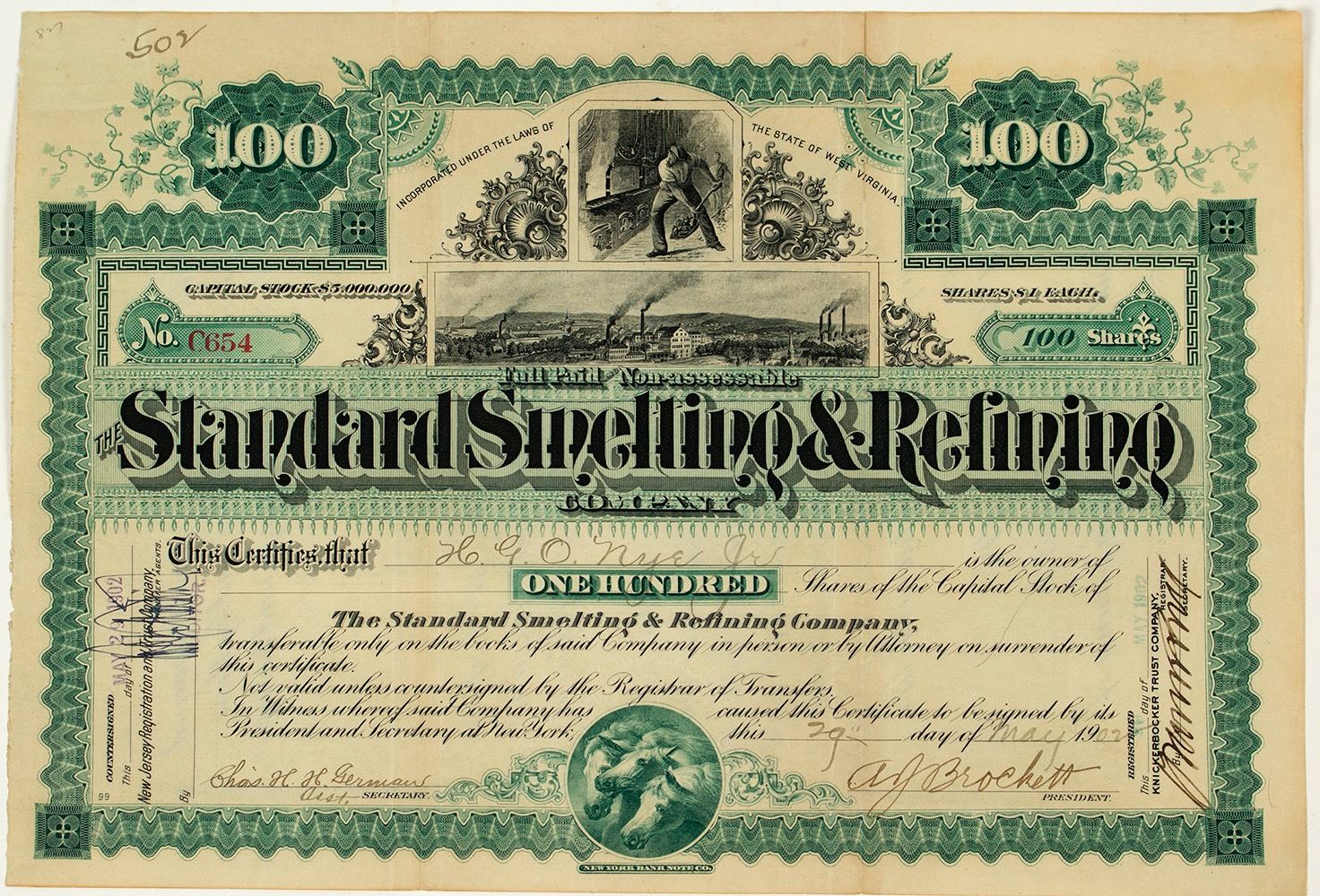 Inc. in West Virginia. No. C654, issued for 100 shares to H.G.O. Nye Jr. on May 29, 1902. Signed by AJ Brockett as president and Chas. H.H. German as assistant secretary. Vignette of smelting facility and of worker shoveling coal into furnace. Printed by New York Bank Note Co. Folds with separation, some toning. 7.75" x 11.5" HWAC# 41139 Date: 1902 Location: West Virginia