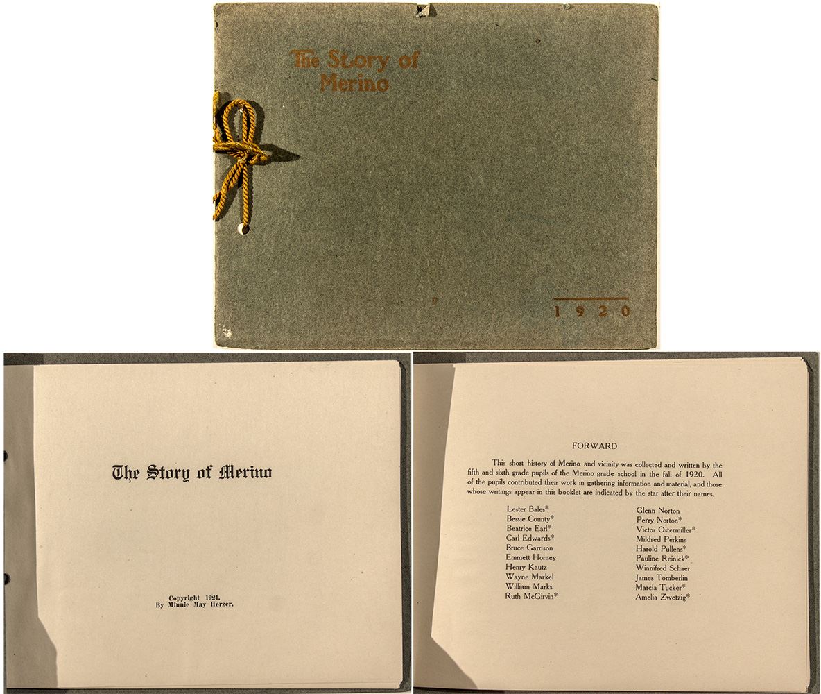 By Minnie May Herzer. Green softcover with string binding. "This short history of Merino and vicinity was collected and written by the fifth and sixth grade pupils of the Merino grade school in the fall of 1920." 29 pages. 6" x 7.75" Logan County. Settled in 1874. Named after the sheep. Cute little history book!