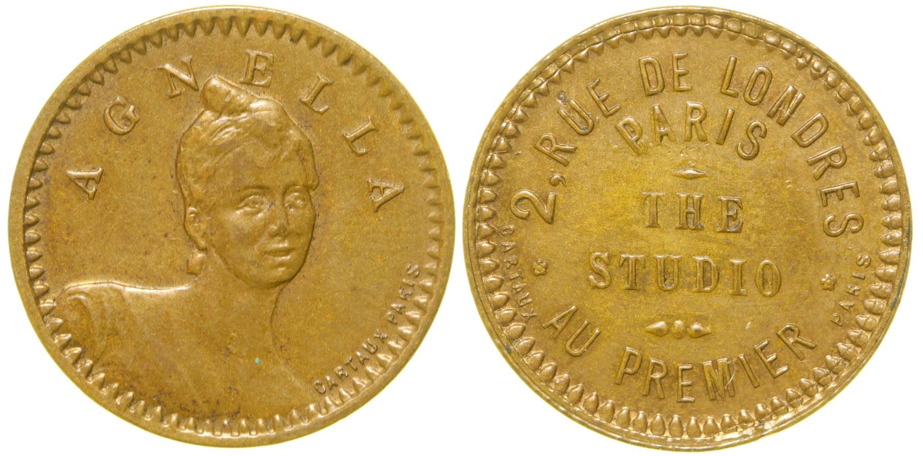 Obv.: Agnella / Cartaux Paris; Rev.: 2 Rue De Londres / Paris / The / Studio / Au Premier. Br. rd., 21 mm.