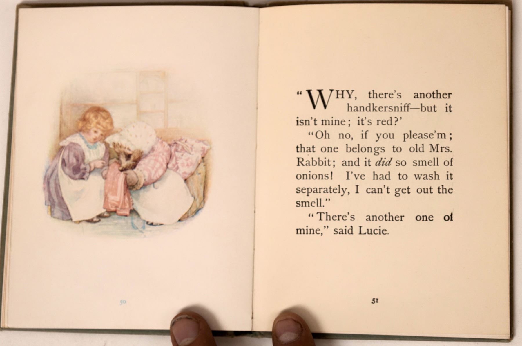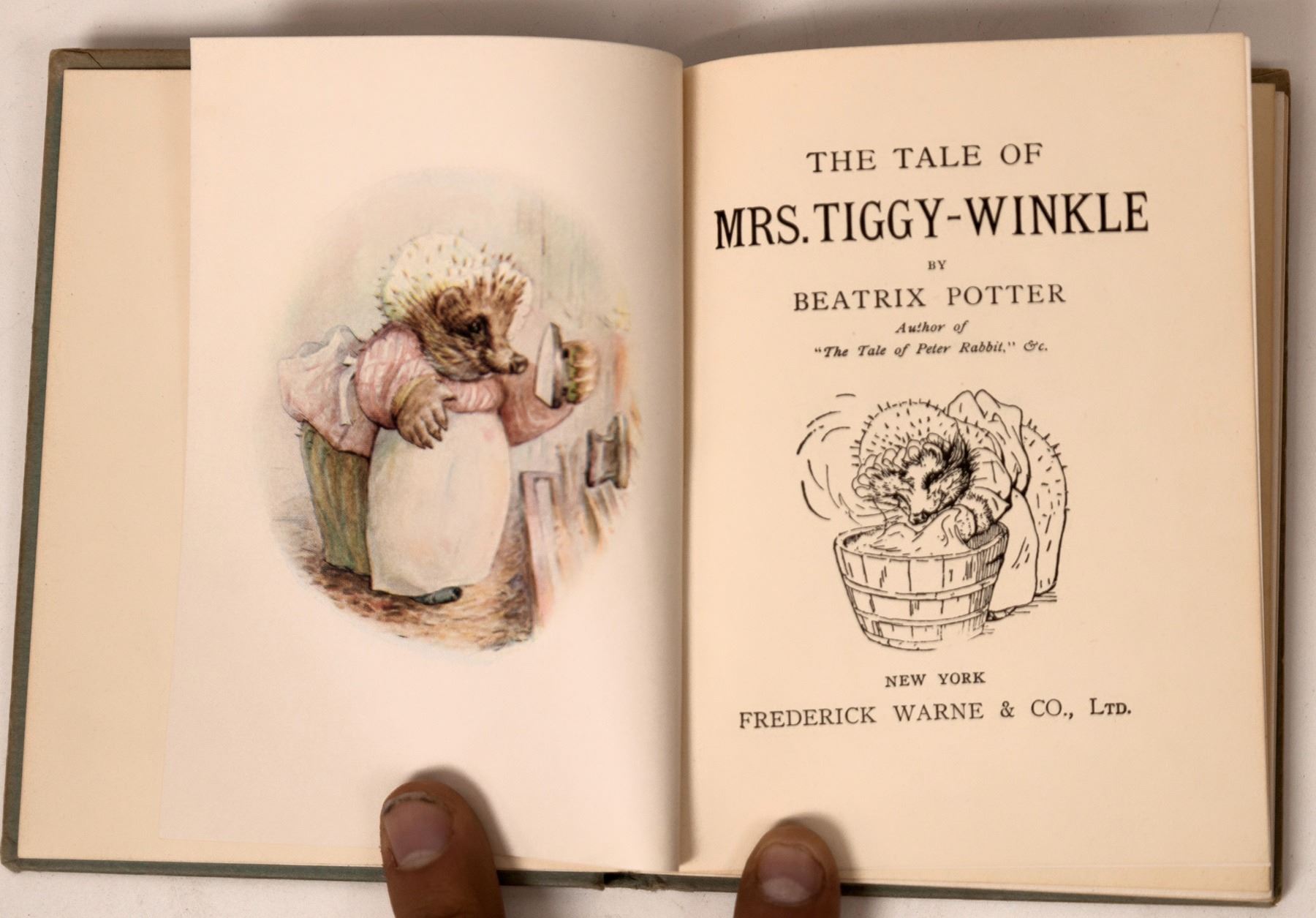The Tale of Mrs. Tiggy-Winkle by Beatrix Potter, 1st Edition 1905. 3 circular punches in upper right corner on 3 early pages. No apparent ink or pencil marks. Fly pages clean. Nice color illustrations. 85pp.