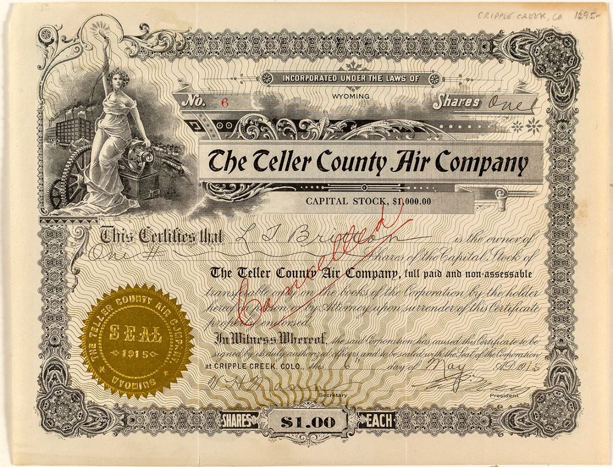 Very rare. Inc. in Wyoming. Low number 6, issued for one share on May 6, 1915 in Cripple Creek, Colorado. Pen cancel. Gold seal and vignette of allegorical woman holding up light bulb in front of factory. The company provided the compressed air necessary for this time period's mining drills. Folds. Chip to upper left corner. (Prag Collection) City: Cripple Creek State: Colorado Date: 1915 hwac# 34216