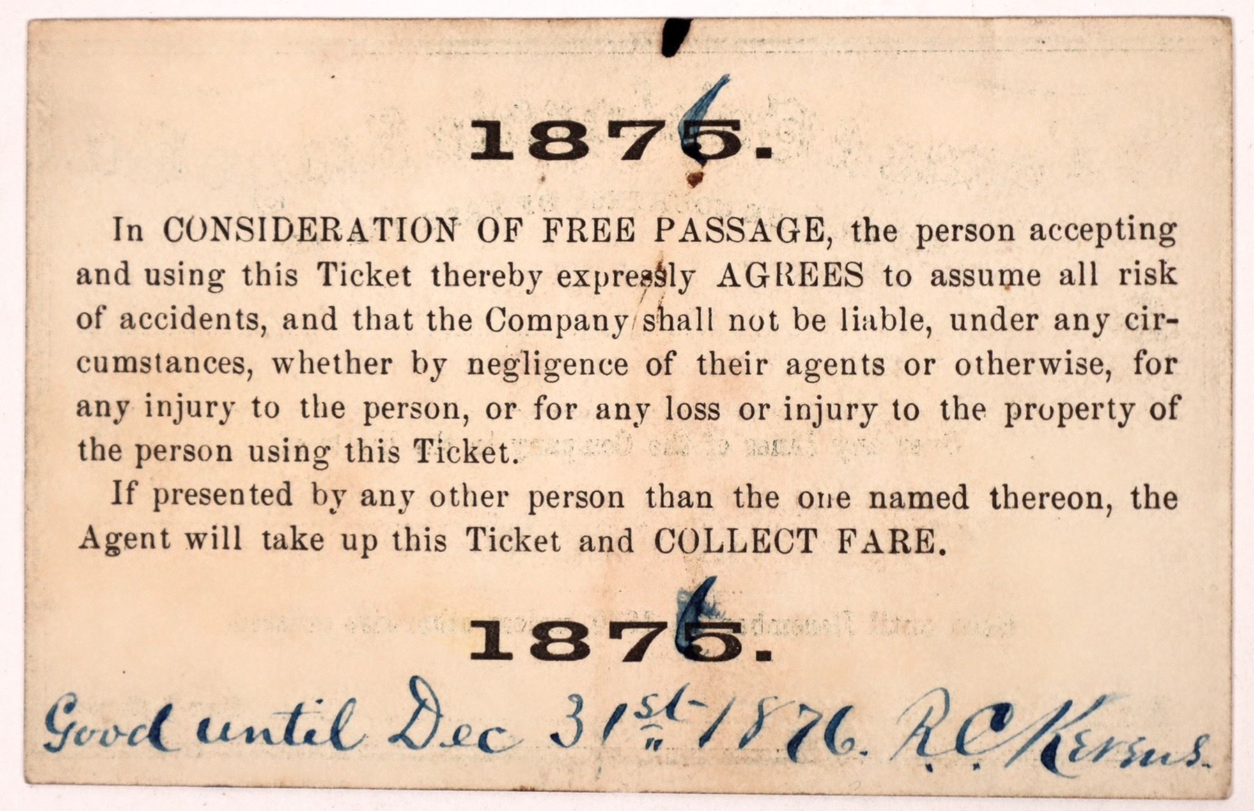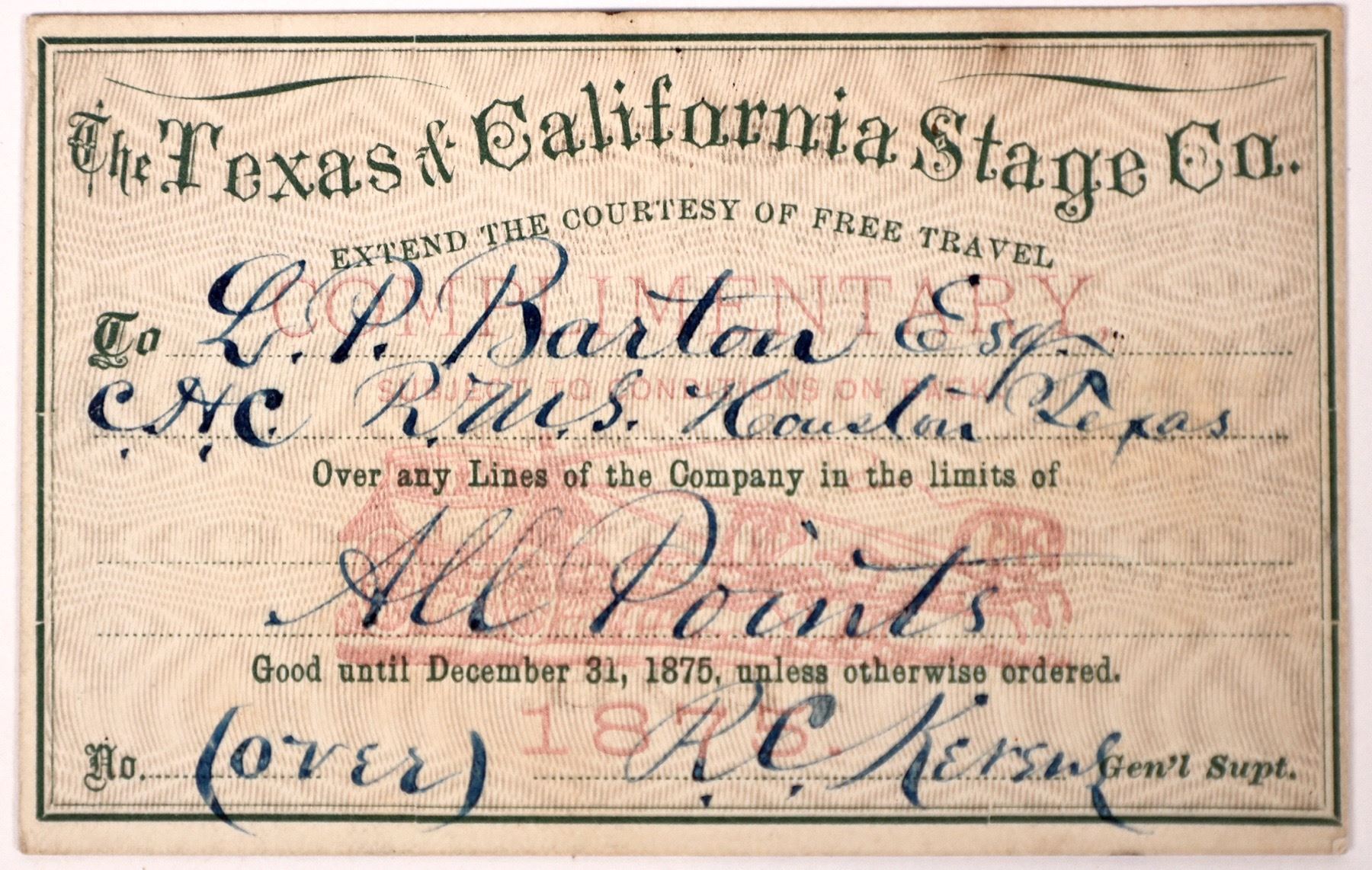 Pass issued for 1875 to L.P. Barton, Esq. over all points. Signed by R.C. Kerens as general superintendent. Beautiful calligraphy writing & stagecoach vignette. Please see photos. This company was organized in 1874 and established daily service in 1875, operating between Ft. Worth, Texas and San Diego, California. The main route was 1,700 miles long. As railroads began to spring up on the route, most service was shifted to Arizona. Headquarters moved from San Diego to Yuma to Tucson.