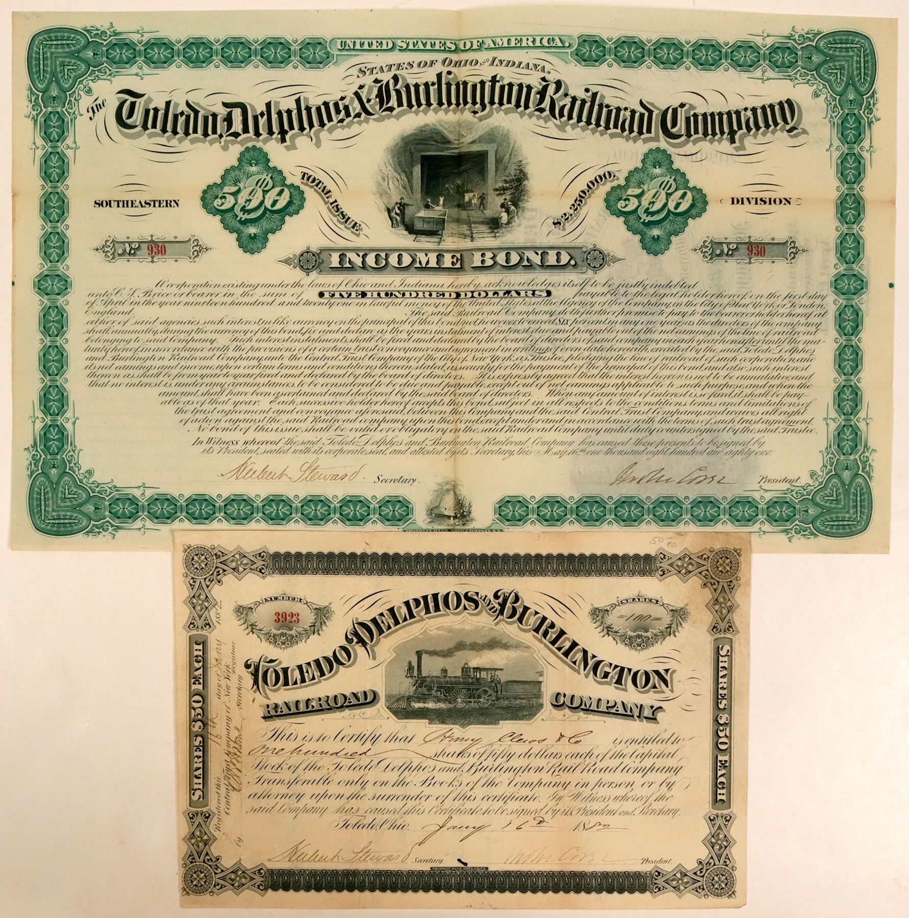 2. #3923, I/U, 100 shares @ $50 par issued Jan 16, 1882. Black, no seal, vignette top 4-4-0 under steam r-l. Franklin Bank Note Co printer. Certificate no known to exist. VF.