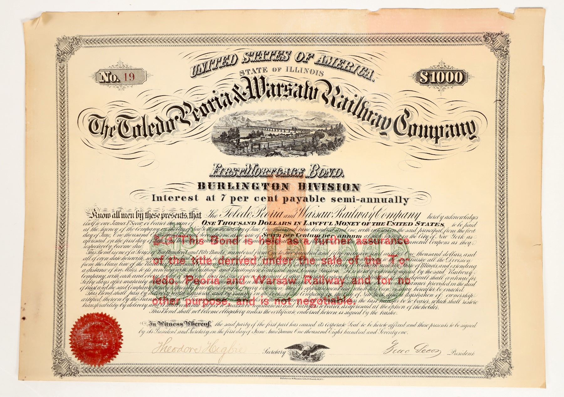 State of Illinois. The Toledo Peoria & Warsaw Railway Co.$1000 7% First Mortgage Bond issued June 1871, due 1901. vignette of train top center, RN-W2 center front. 52 coupons attached. Pelletreau & Raynor Litho printer. VG+ cond. This has never been here at Holabird before.