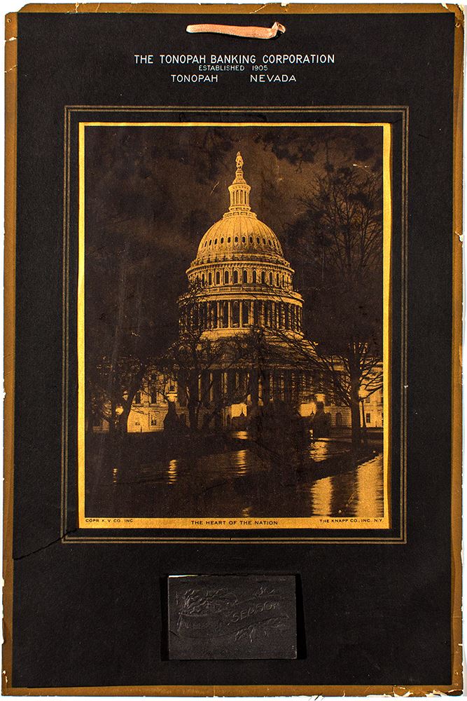 A 9" x 7" gilt-tinted photograph of the Capitol Building in Washington D.C. is the centerpiece to this 1924 calendar for the Tonopah Banking Corporation, Established 1905. Photograph is titled "The Heart of the Nation," by THe Knapp Co. Inc, N.Y. Small calendar pad at the bottom with all months present. Overall, 15" x 9.75." Rips and chips to border and matte. Some scratches to photograph.