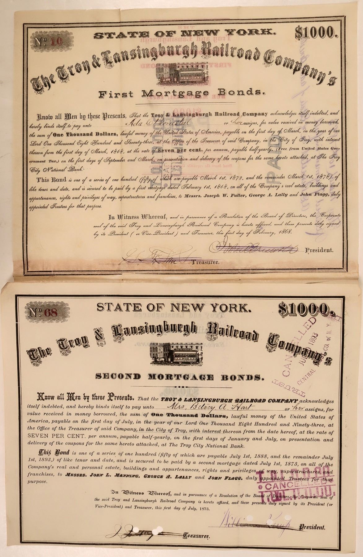 Two certificates. Both I/C, Black, $1000, 7%, embossed seal, vignette top horse drawn street car r-l. Unknown printer. VF. #10, First Mortgage issued Feb 1, 1868 due 1873. #68, Second Mortgage issued July1, 1873 due 1893.