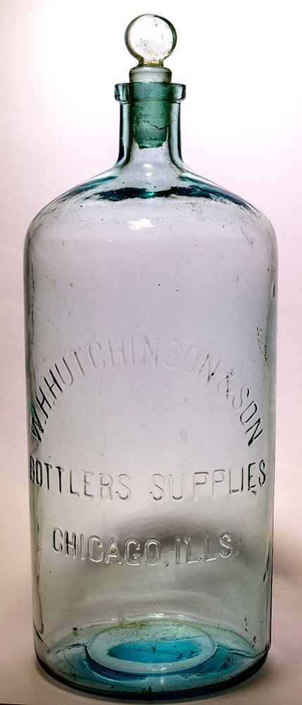 Choice aqua 6" diameter, 14" tall, appx one gallon, old aqua glass. "W.H. Hutchinson, Bottlers Supplies, Chicago, Ills." in letters 1/2" tall. Dead mint, clean. The ultimate for any Hutchinson collector!! Comes with aqua glass stopper, probably not original to the bottle. Date: Location: Chicago, Illinois HWAC# 48311