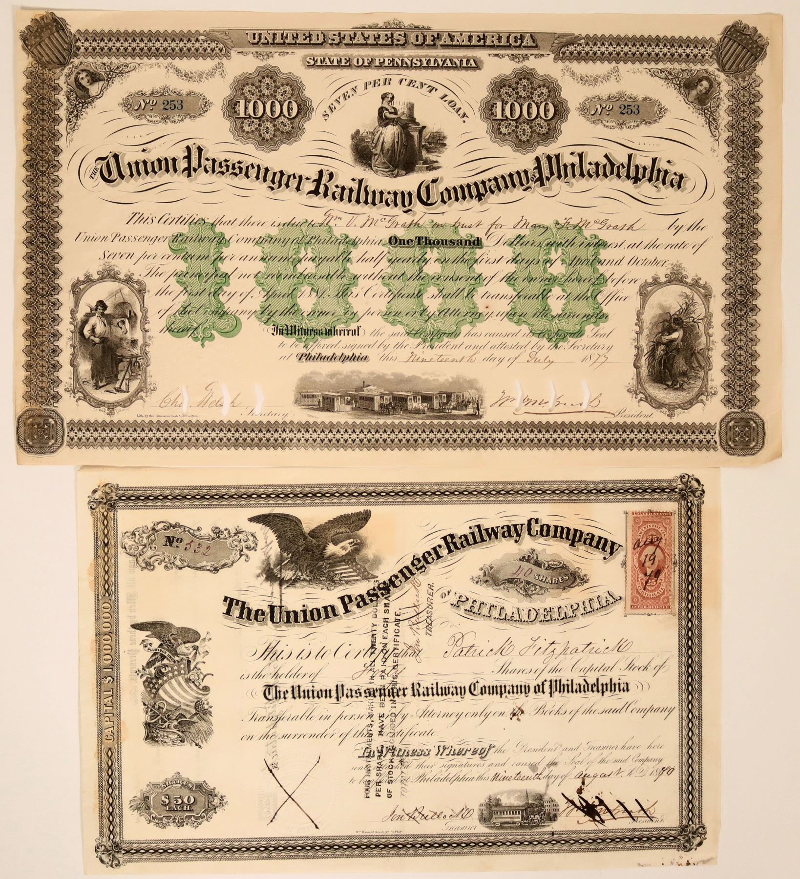 2 certificates. Incorporated on November 22, 1873. 1. #253. I/C, $1000 7% 10 yr. Loan issued April 1, 1871. Black, embossed seal, vignettes: top woman a/ships background, bottom right farmer, bottom left blacksmith, bottom trolly rail yard. 1000 green underprint. American Bank Note Co. Large horizontal format. VF 2. #532, I/C, 40 shares @ $50 ea. issued Sept 7, 1927. signed president and secretary. Black, embossed seal, vignettes: top eagle, left eagle on union shield, . bottom right trolly . 25c revenue stamp upper right. American Bank Note Co. EF