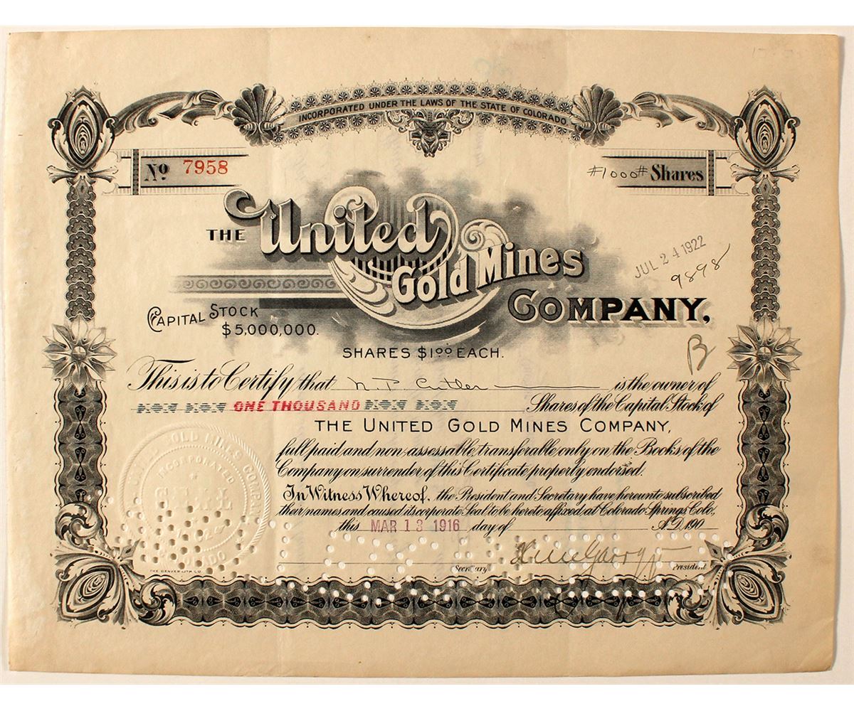 Cripple Creek District, El Paso County. Incorporated under the laws of the State of Colorado. No. 7958 issued for 1000 shares to N.T Cutler. Datelined Colorado Springs, March 13, 1916. Cancelled by hole punch. Organized by the Woods Investment Company of Cripple Creek, it was purchased by The Golden Cycle Corporation. Production: by lessees in 1916, 17,435 tons of ore worth $425,869, against 13,966 tons and $181,657 in 1915.