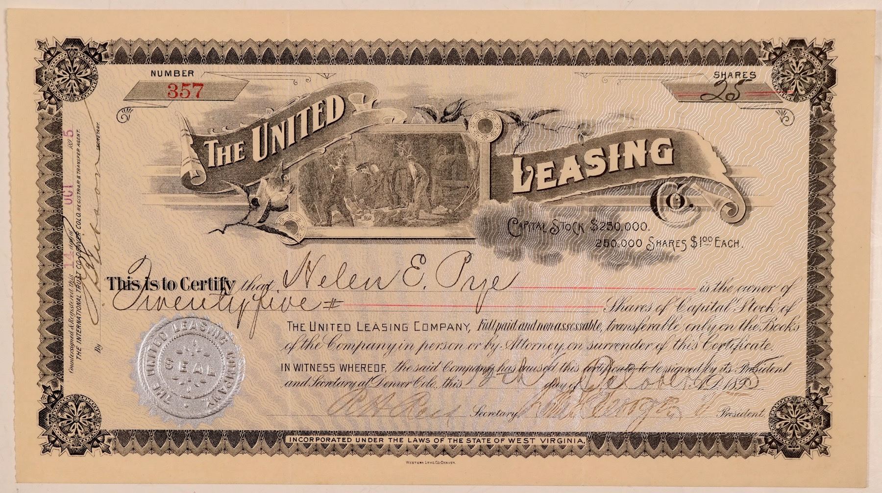 Incorp. West Virginia. Cert. #357, I/U, Oct 12, 1895 to Helen E. Pye for 25 sh., signed by D.W. George as president and R.H. Reed as secretary. Black, embossed silver seal. No information on their mine locations. Nice certificate we haven't seen before with miners underground and fancy scroll. Western Litho. Co. printer. Uncanceled. EF.