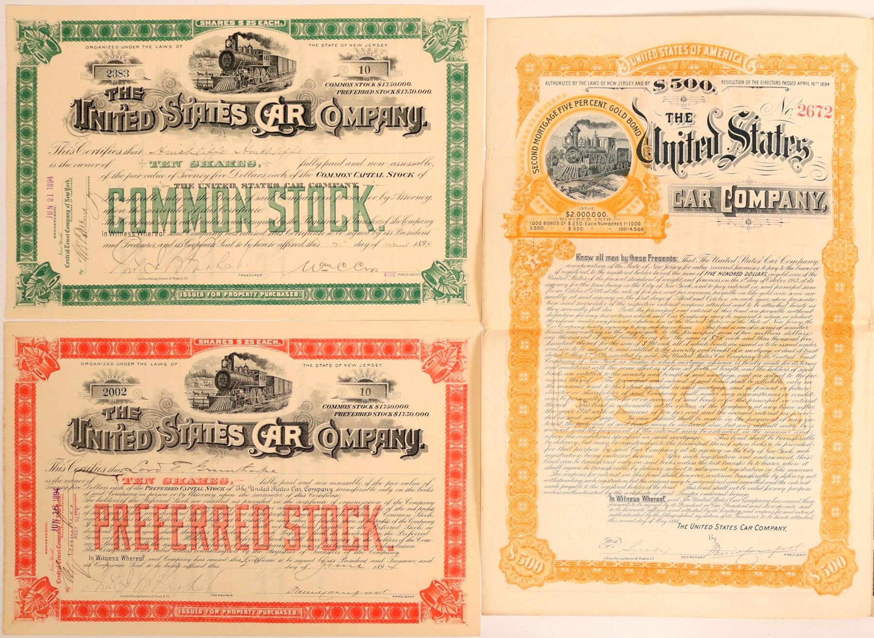3 certificates. Incorp New Jersey 1892. 1. #2672, I/U, $500 5% Second Mortgage Gold Bond issued May 2, 1894. Orange, embossed seal, vignette top left train r-l. $500 orange underprint, coupons #7-40 attached, Charles A. Searing Litho. EF 2. #2383 (Green) and 2002 (Red), I/U, both 10 shares @ $25 ea., issued June 2, 1894, vignette top train r-l, embossed seal, Charles A. Searing Litho. EF