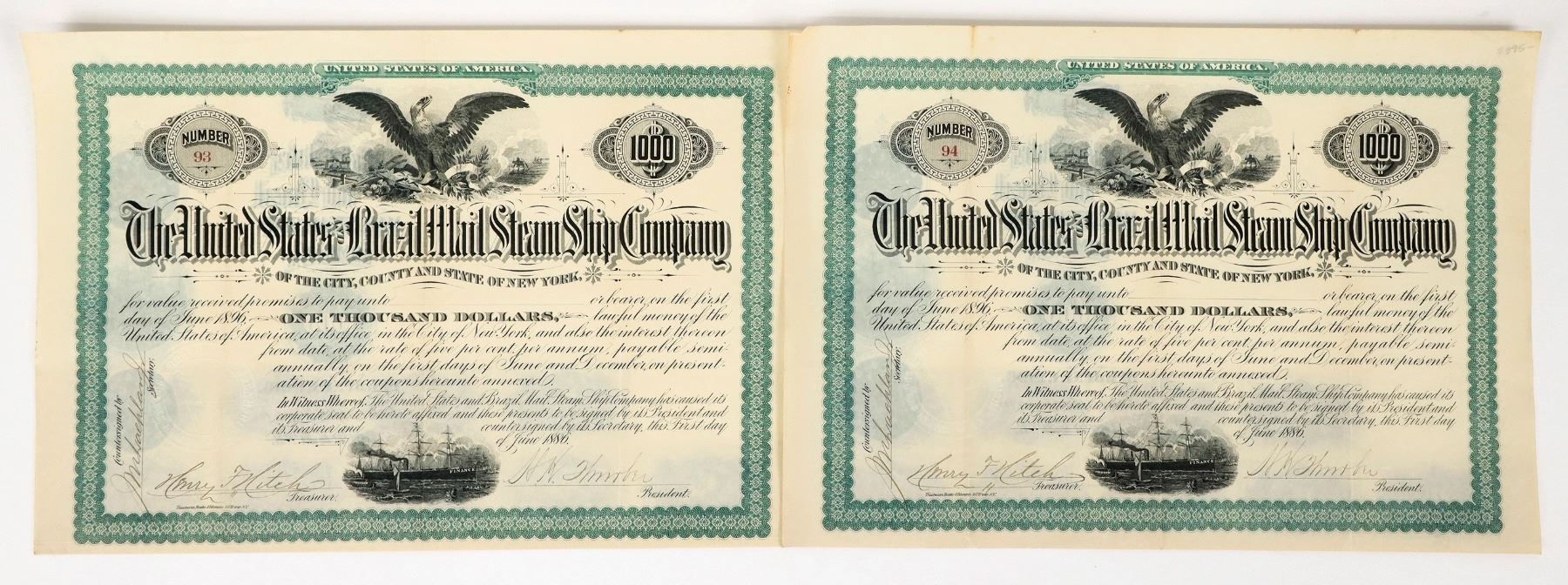 Lot of (2) $1000 Bond certificates, with coupons attached. Each certificate has (1) coupon detached, all others intact. Bonds mature in December or June of 1894, per the coupons and on the reverse. There are vignettes top and bottom, along with an embossed corporate seal lower left. Good to very good condition, some minor staining at edges. Please see photos.