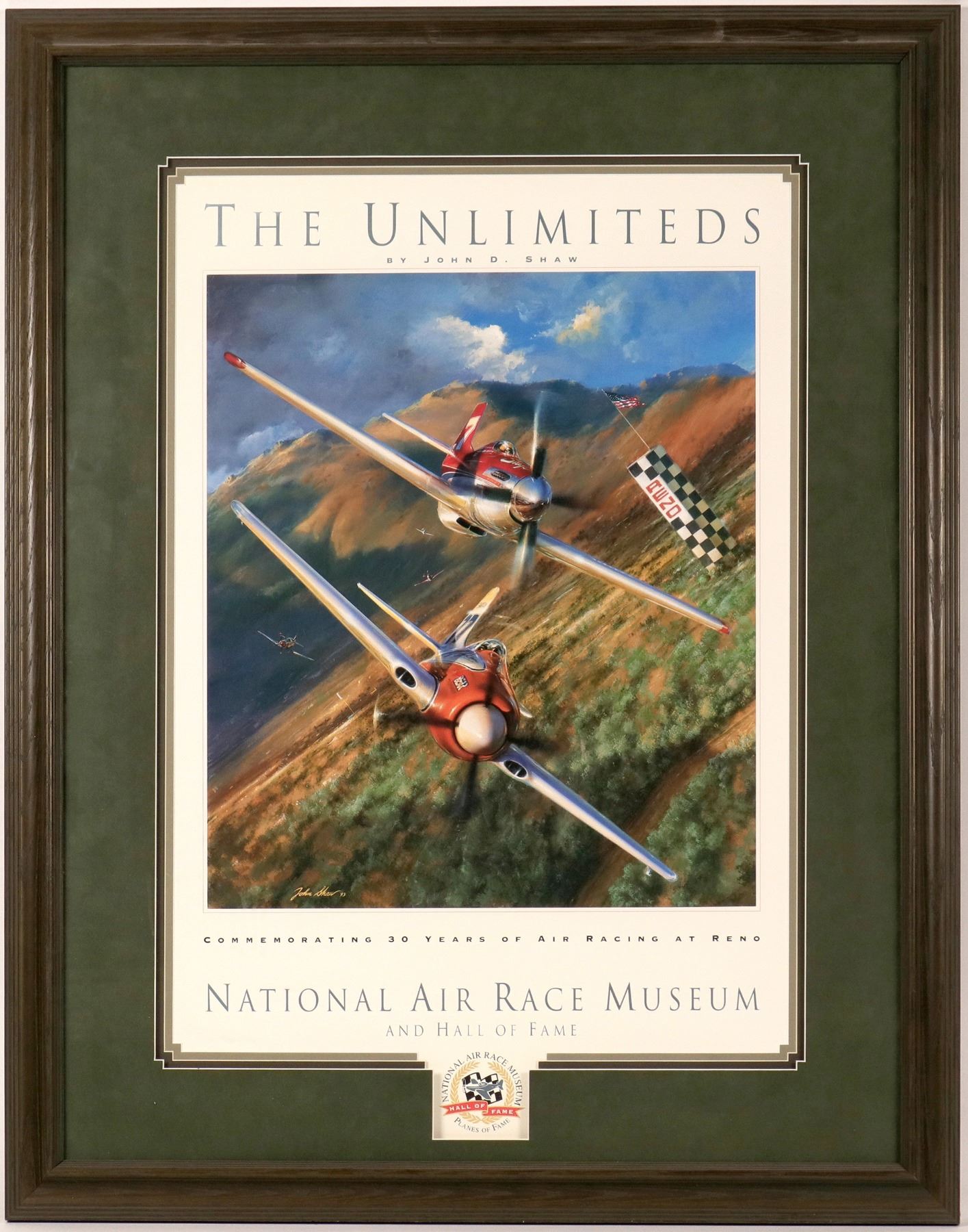 This is a fine art print of "The Unlimited" created by Nevada aviation artist John Shaw to commemorate the National Air Race Museum and Hall of Fame and 30 Years of Racing in Reno. It is triple-matted and framed in excellent condition.