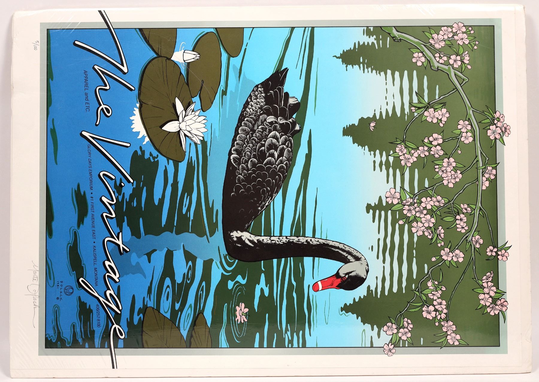Limited edition poster titled The Vintage by renowned Montana artist Monte Dolack. 5/100. Signed in lower right corner. Inscribed on poster is: Apparel and Etc. Glory Days Emporium. #1 First Avenue East. Kalispell, Montana. 406/257-8100. Also inscribed Dolack 1981. Mounting board size 18"wide, 25 1/4" high. Shrink wrapped. See photo. Note: Dolack's works have been displayed around the world. In 2000, The Missoulian and Montana Century select him as one the 100 most influential Montanans of the 20th century.