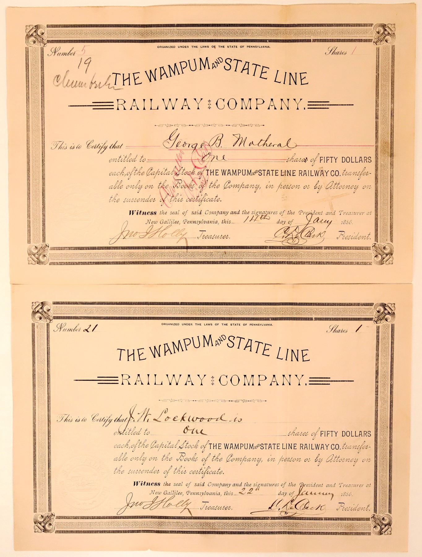 2 certificates. Incorp. 1886 Pennsylvania. Combined Feb. 12, 1886 with The Pittsburgh, Marion & Chicago Railway Company. Both certs : Black, $50 par, January 1886, signed D. DeClark President, embossed seal, no vignette, unknown printer. VF. #5, I/C, One share. #21, I/U, One share.
