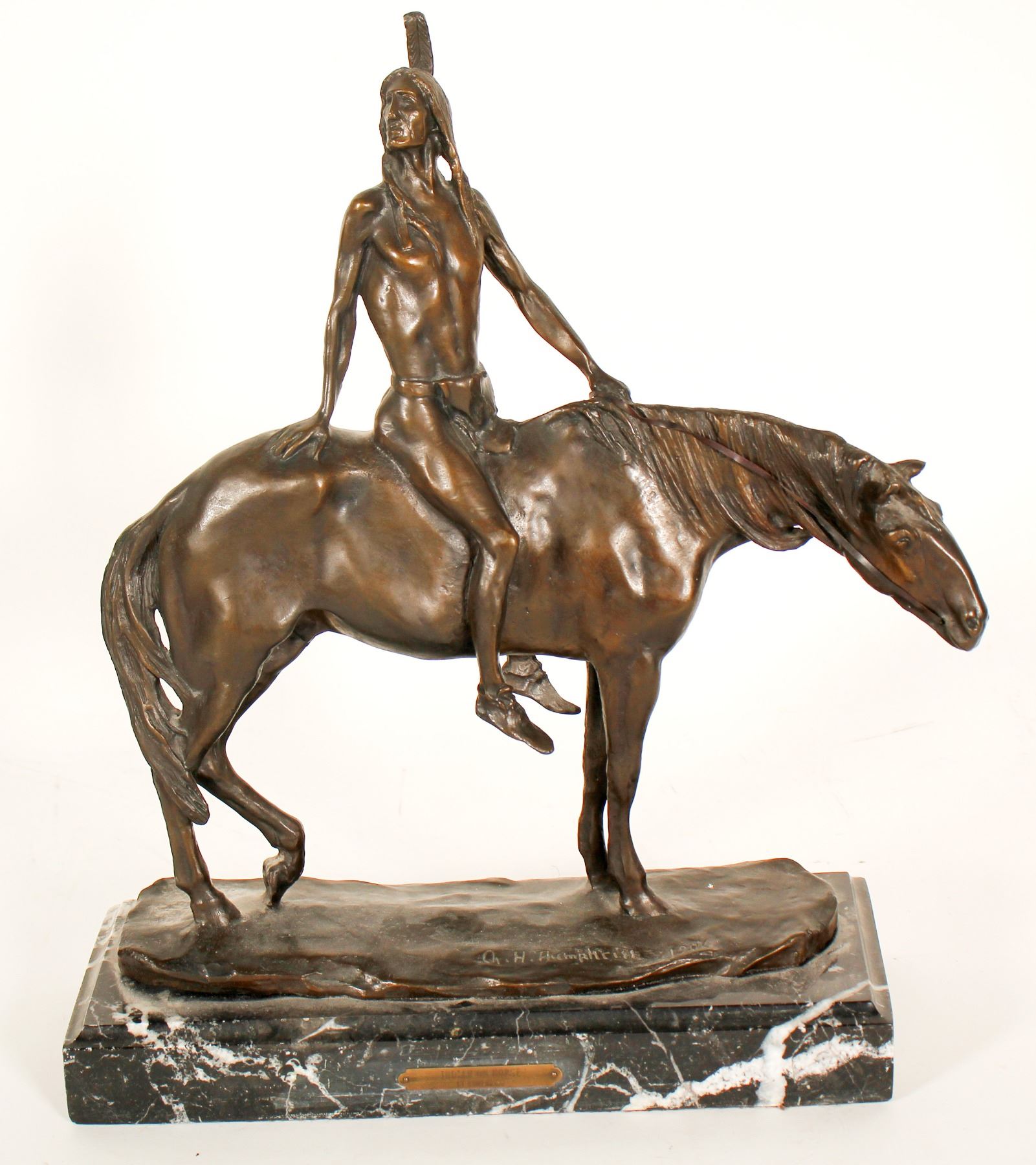 This is a Charles Humphriss Bronze of a Native American titled "The Warrior" c. 1904, and it is likely a posthumous casting, as there is no discernible foundry mark. The sculptural work of Charles Humphriss tended towards Native American ritual subjects portraying what he believed was a more truthful representation of the American Indian. In striking contrast to the commonly portrayed image at the time of the ësavageí, his work sought to celebrate the more peaceful and spiritual nature of these majestic people. Humphriss was born in England in 1867, but immigrated to the United States and by the late 19th century was living in Pleasanton, NY. As an established artist he kept a studio in New York City, where he became a member of the National Sculptor Society and the Society of Independent Artists. During his time, Humphrissí sculptures were exhibited at the New York Academy of Design, the Pennsylvania Academy of Fine Art, and award winning at the Panama-Pacific Exposition in San Francisco. Humphriss died at the age of 65 in New York in 1934. The sculpture is 16.25" tall x 12.75"length x 5.25". width. On a beautiful black marble base. Dated 1904 and no foundry markings detectable. Due to weight, extra shipping will apply. (25.6lbs.)